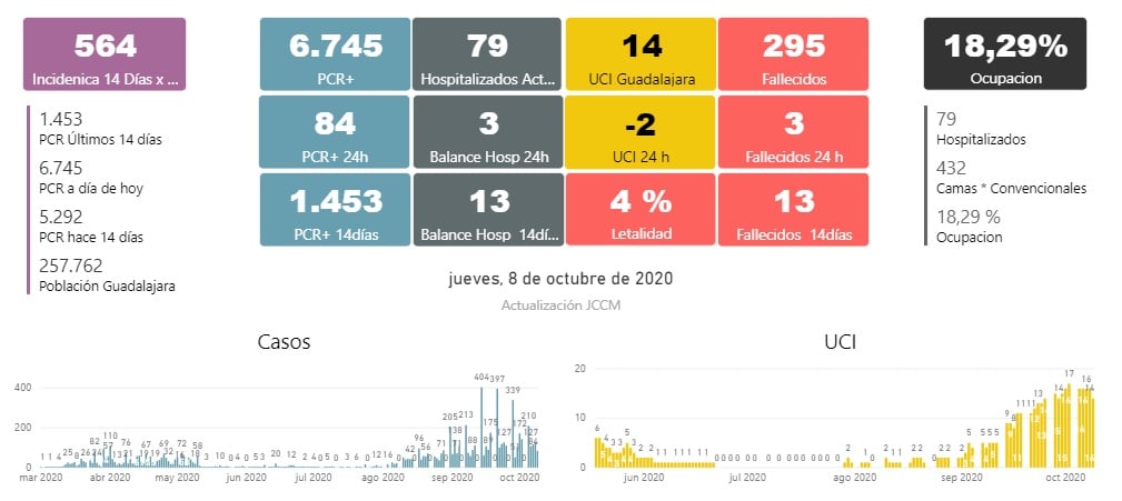 Muchas gráficas a todo color, para poner en curvas y barras los datos recopilados del Ministerio de Sanidad y de la Junta de Comunidades. Eso es lo que viene haciendo el Ayuntamiento de Guadalajara desde hace meses, aunque no sean tantos los vecinos que que lo sepan. Para descubrir los gráficos no ayuda demasiado el recorrido que hay que hacer por la web municipal para encontrarlos. Los lectores de LA CRÓNICA lo tienen más fácil: les basta con hacer clic aquí.
