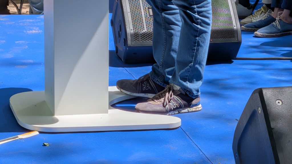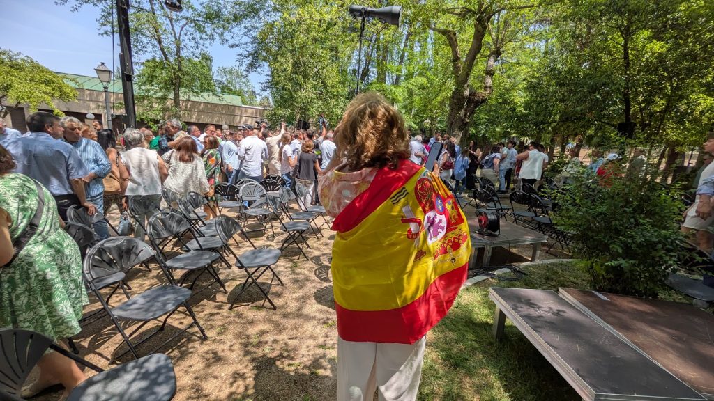Cuando andabas por ahí, observabas que la única bandera de España cubría la espalda de una señora con permanente. Colores rojigualdas que apenas se veían más allá de algún abalorio, como la pulserita de la guardaespaldas de Feijóo, vestida con traje de color «azul servicio secreto» y tan espigada que no pasaba desapercibida.