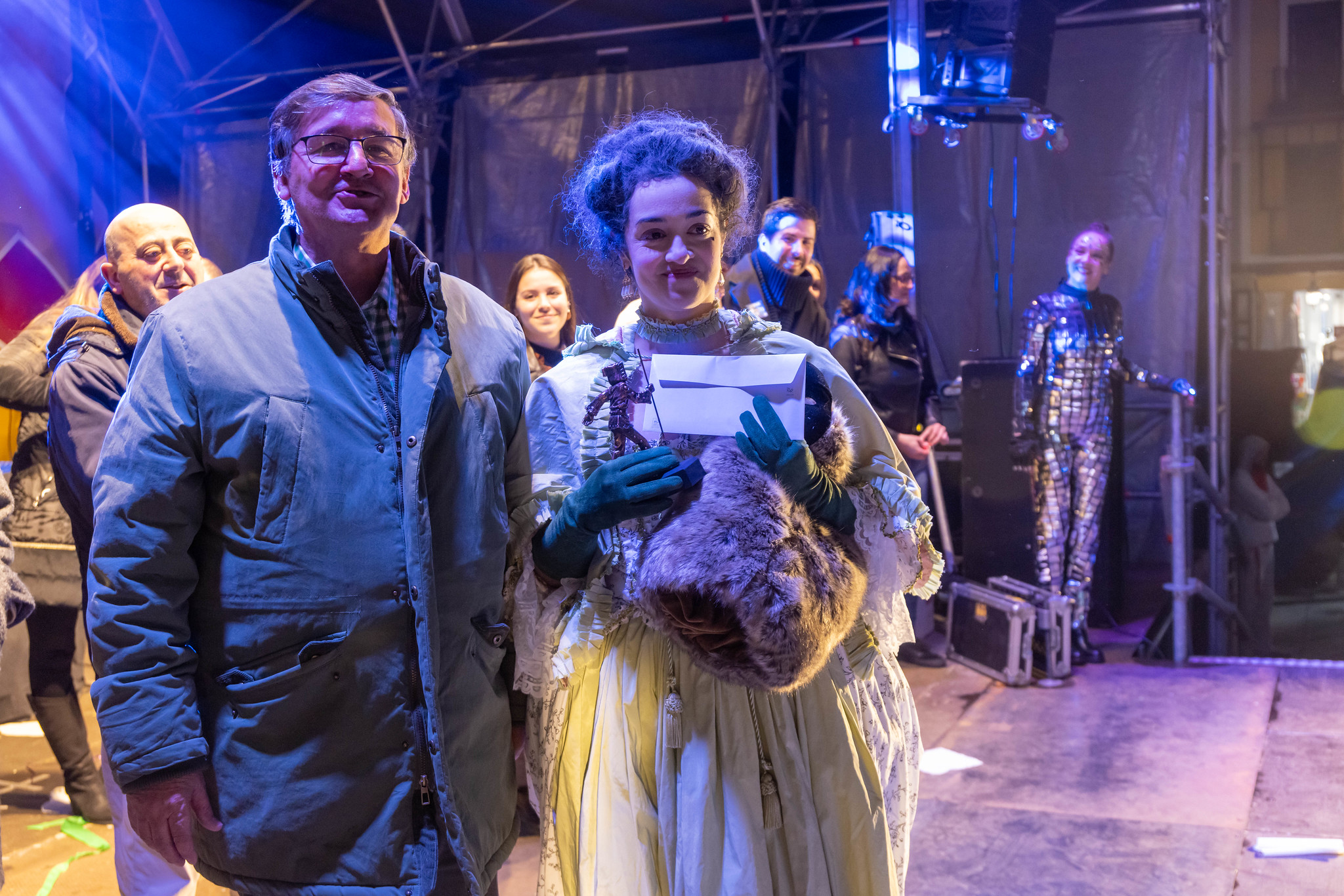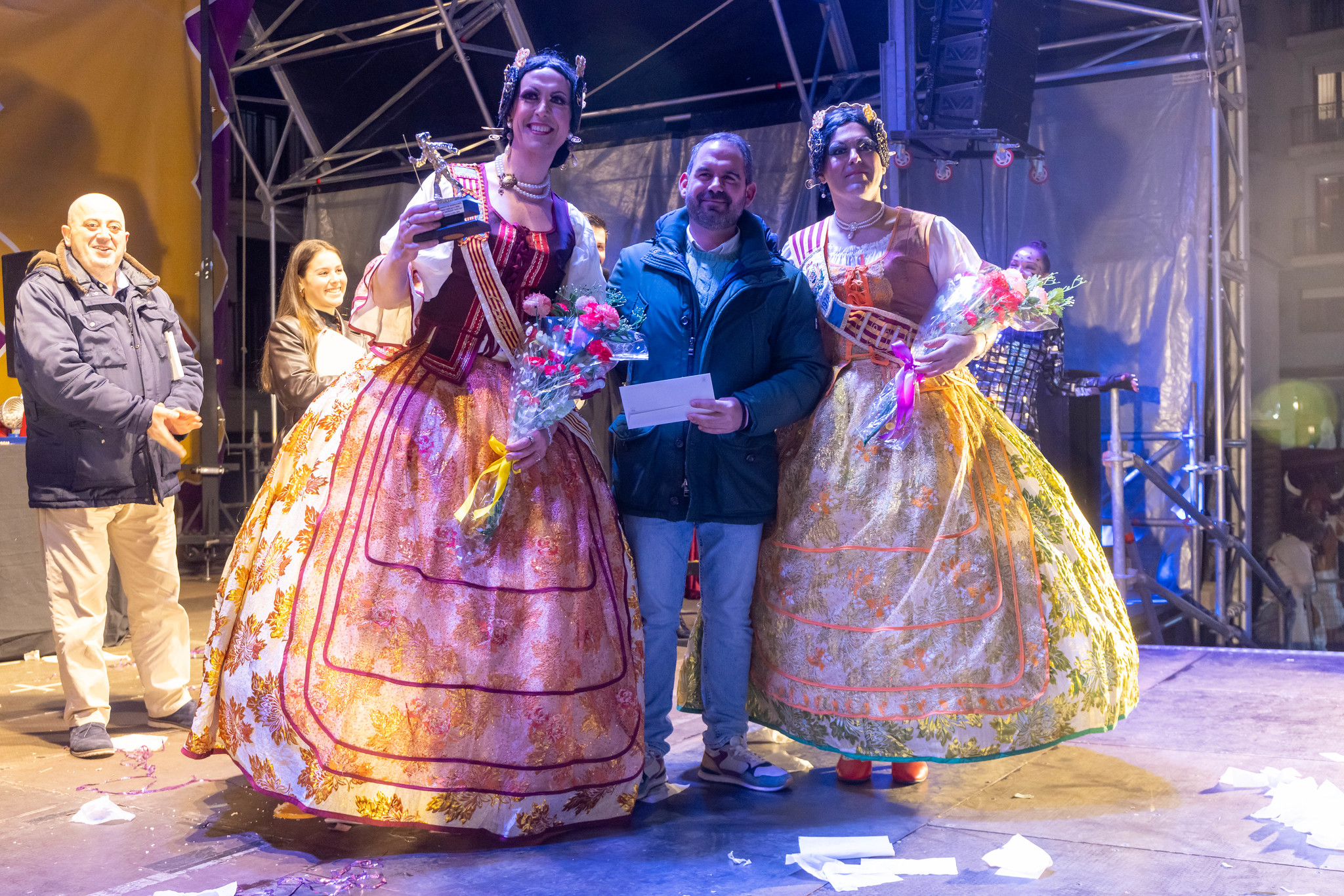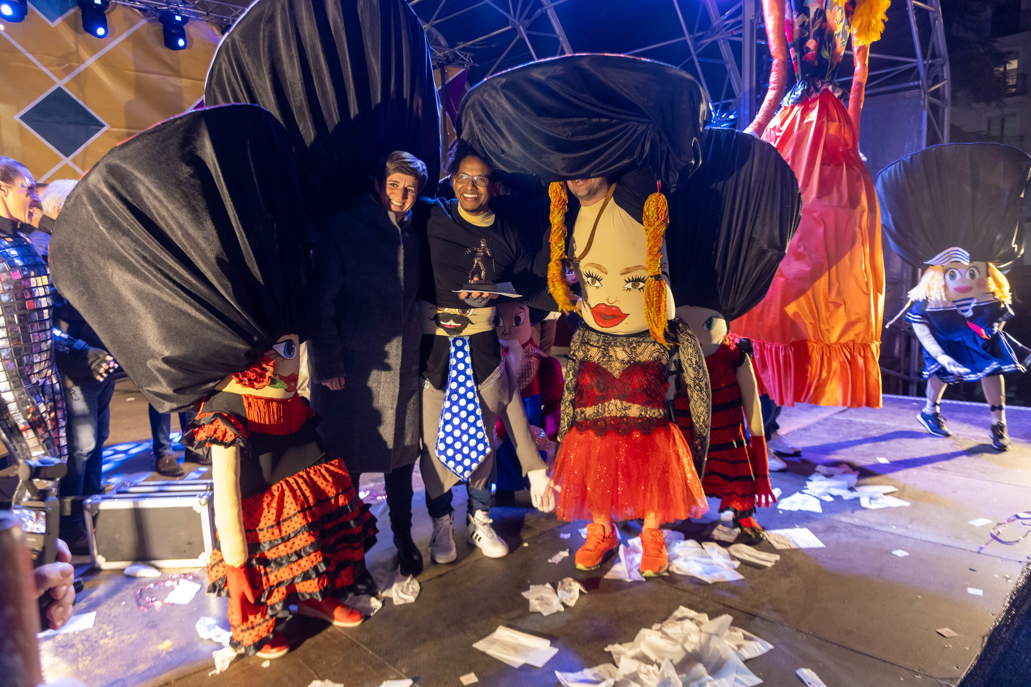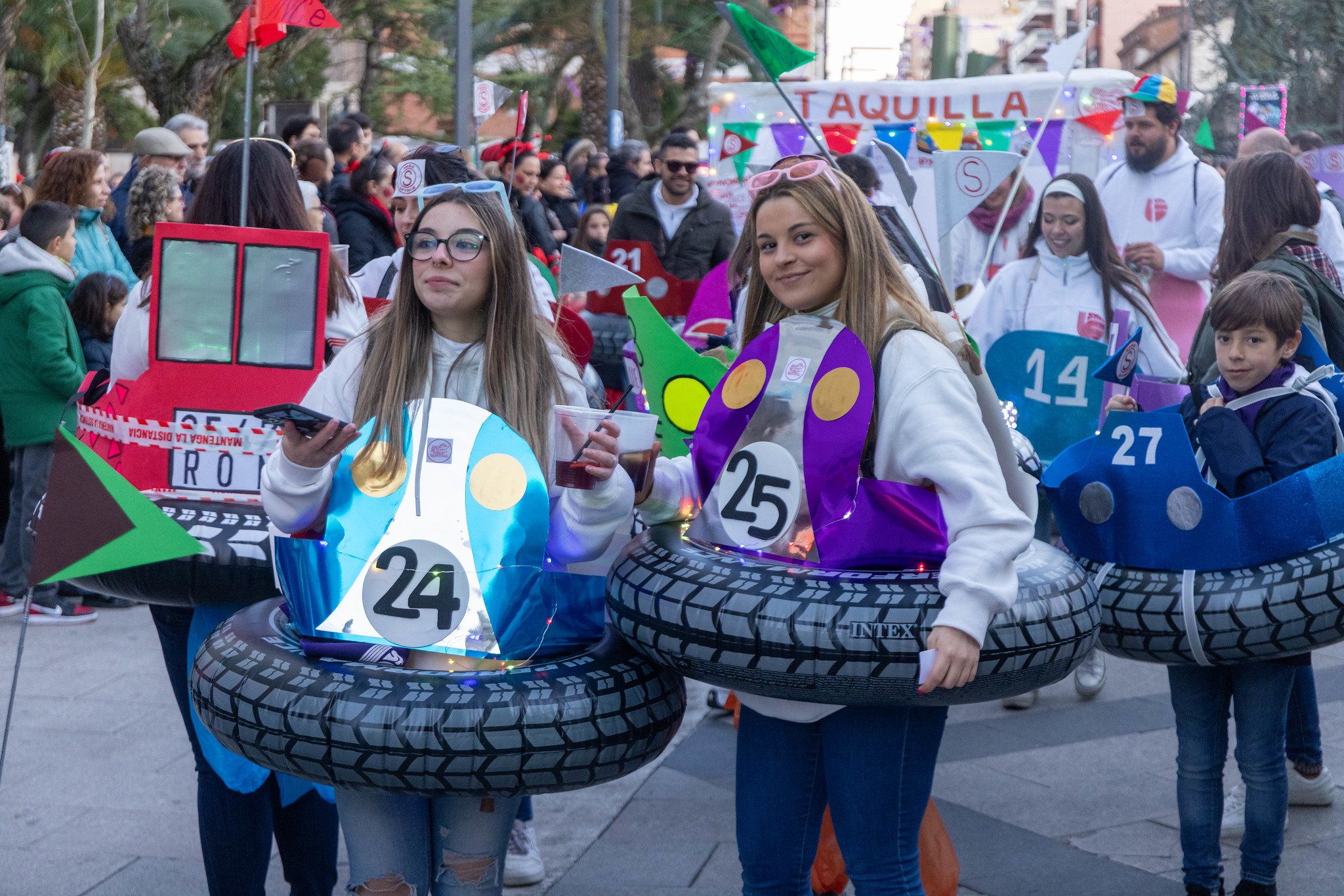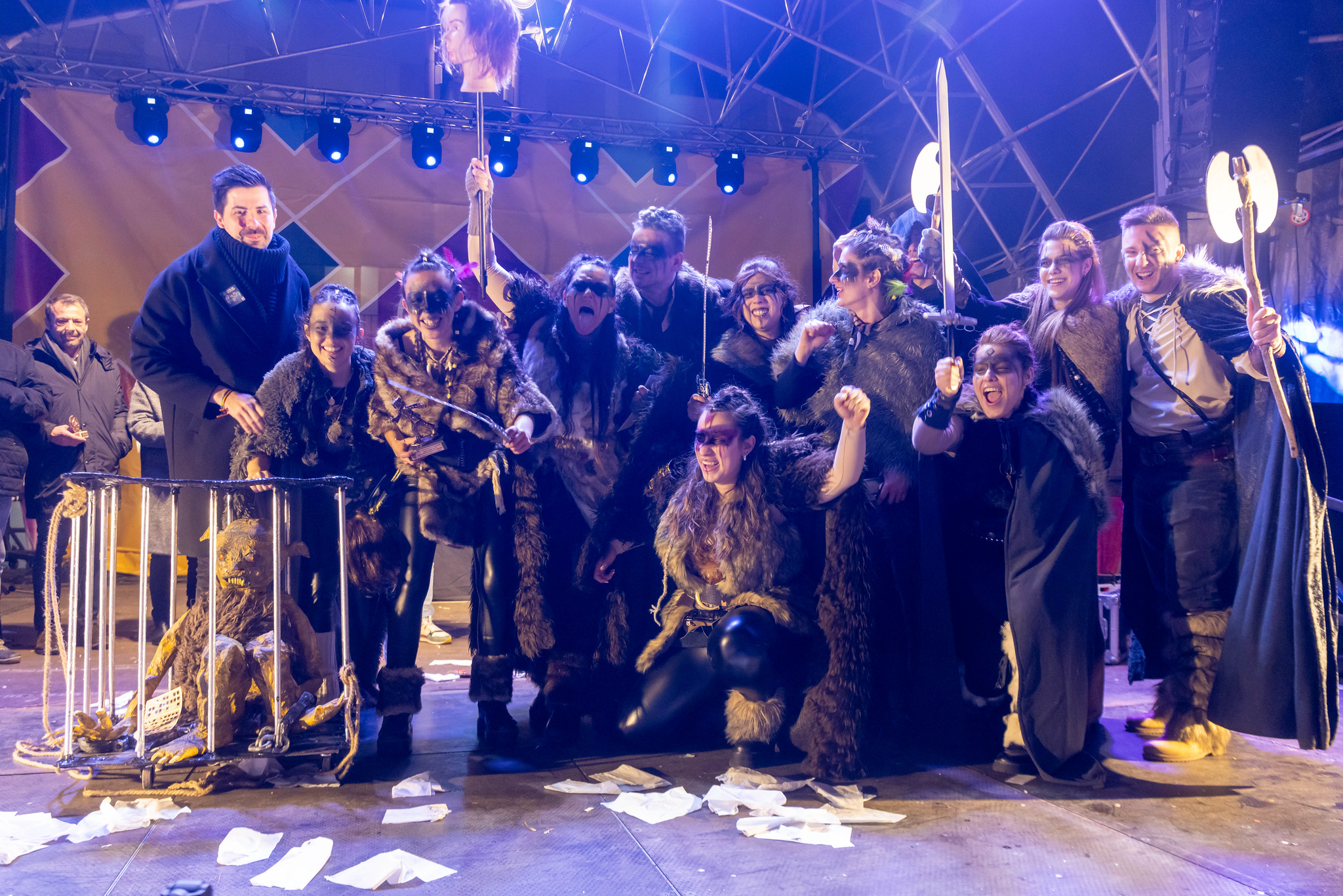 En grupos, algunos de ellos con más de 50 personas, el primer premio (1.000€) fue para las “Brujas fofuchas”, con una elaboración muy artesanal, el segundo premio (800€) para “Con vespas y a lo loco”, con toda una escudería realizada en cartulinas, el tercer premio (600€) “Vikingos”, con barco incluido, y el cuarto premio (400€) para “Los enanos y la muñeca Calenda”.