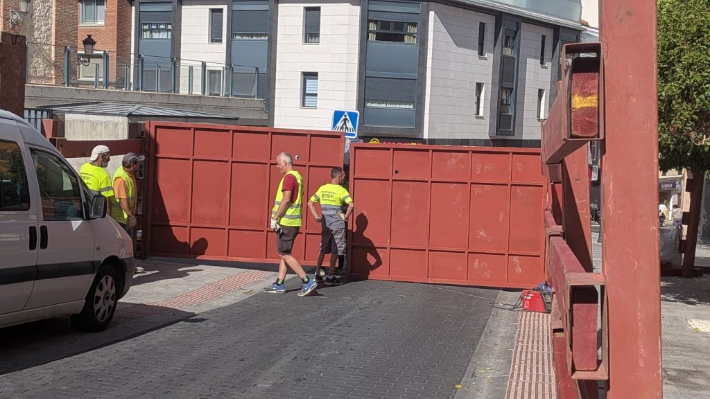 Aún faltaban por colocar, a primera hora los últimos metros, que serán los primeros: los que van desde los corrales hasta la esquina del «Maragato» y algunos metros más. Los operarios se han afanado en la instalación con rapidez y eficacia incluso de las puertas antirretorno para los astados, un recurso técnico que se repite en varios puntos del recorrido. La de la imagen es la instalada en el inicio de la Cuesta del Reloj: