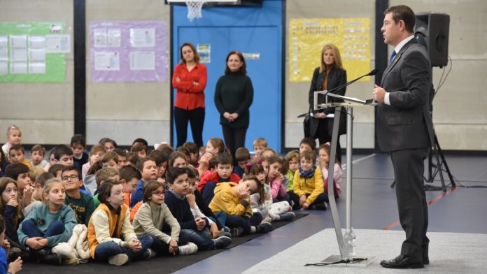 El presidente de Castilla-La Mancha, Emiliano García-Page, ha presidido este viernes en Guadalajara el acto de inauguración del nuevo gimnasio del CEIP ‘Parque de la Muñeca’, al que también han asistido el presidente de las Cortes regionales, Pablo Bellido; el consejero de Desarrollo Sostenible, José Luis Escudero; el alcalde de Guadalajara, Alberto Rojo; el presidente de la Diputación de Guadalajara, José Luis Vega; el delegado de la Junta en Guadalajara, Eusebio Robles; el delegado de la consejería de Educación en esta provincia, Ángel Fernández; y el director del centro, Julián Joaquín Delgado, entre otros.