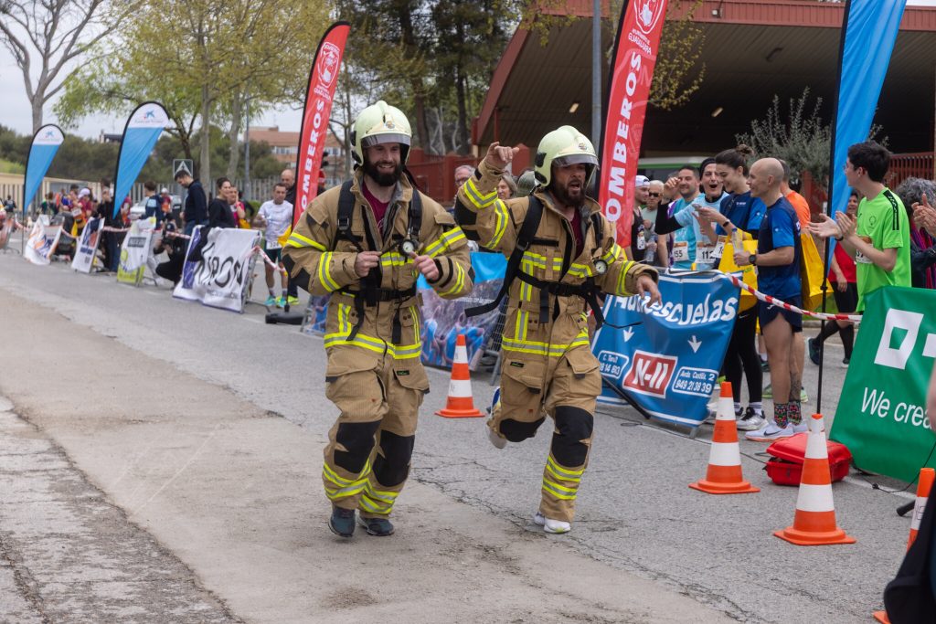 Uno de los momentos más emocionantes de la carrera ha sido el de la llegada a la línea de meta de los bomberos, sobre todo de aquellos quienes han realizado el recorrido con su equipo de trabajo diario, que pesa aproximadamente 25 kilogramos.