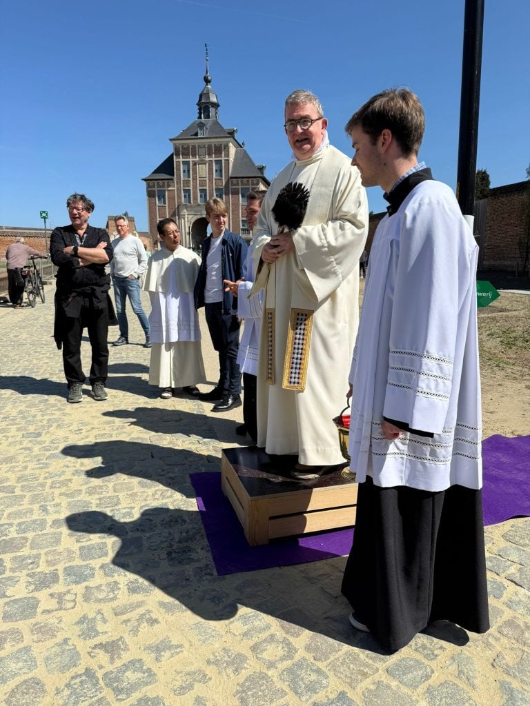 Él y sus dos monaguillos atienden a los que se van acercando al peculiar hisopo, del tamaño de una escobilla king size. También lo hizo este paseante viajero, alertado de que no se volverá a repetir la ceremonia hasta dentro de un año, lo cual acrecienta nuestra satisfacción más incluso que nuestra fe.