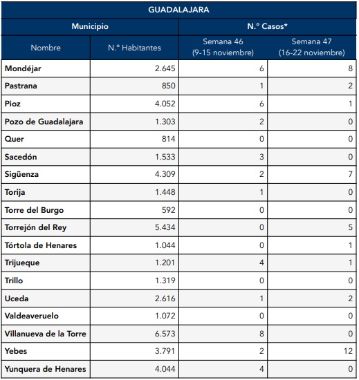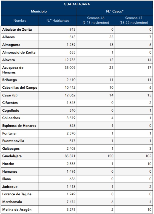 Con puntualidad, han llegado este viernes los datos de casos de COVID en los pueblos de Guadalajara con más de 500 habitantes, así como en la capital. La estadística de la Junta de Comunidades corresponde a la semana 47ª del año, que es la que concluía el pasado domingo, 22 de noviembre.