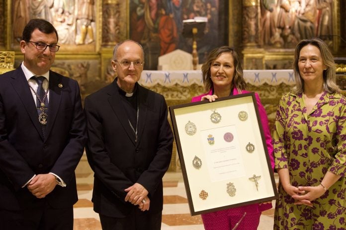 De la mano del presidente de las cofradías, José González; el obispo Julián Ruiz y la alcaldesa Ana Guarinos, la pregonera recibía el cuadro de recuerdo con todas las medallas de las cofradías de Guadalajara.