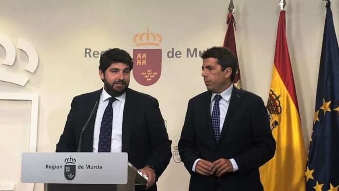 El presidente murciano, Fernando López Miras, y presidente de la Diputación de Alicante, Carlos Mazón, han dejado claro este lunes que no permitirán que "se recorte ni un solo litro de agua del trasvase Tajo-Segura" ante el clima de "desasosiego" por las últimas medidas de la ministra para la Transición Ecológica en funciones, Teresa Ribera, de que los municipios ribereños entren en la Comisión de Explotación del Trasvase.
