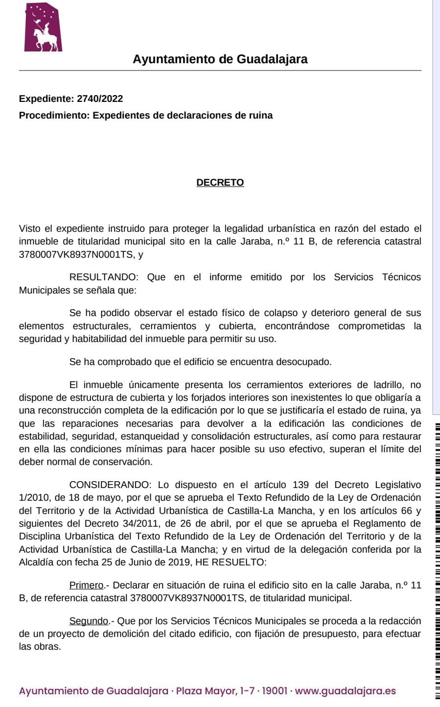 El asunto ha saltado durante el punto en el que se trataban los Decretos de Alcaldía y Acuerdos de la Junta de Gobierno Local. Se trataba, en concreto, de un Decreto firmado por el primer teniente de Alcalde, Rafael Pérez Borda (Ciudadanos). Terciando en el debate, el alcalde de Guadalajara se ha comprometido a que no se derribará este histórico edificio y que se le dará algún uso. La recuperación de «Harinas Mora» era una de las medidas contempladas por el PSOE en el programa electoral con el que llegó Alberto Rojo llegó a la Alcaldía en 2019.