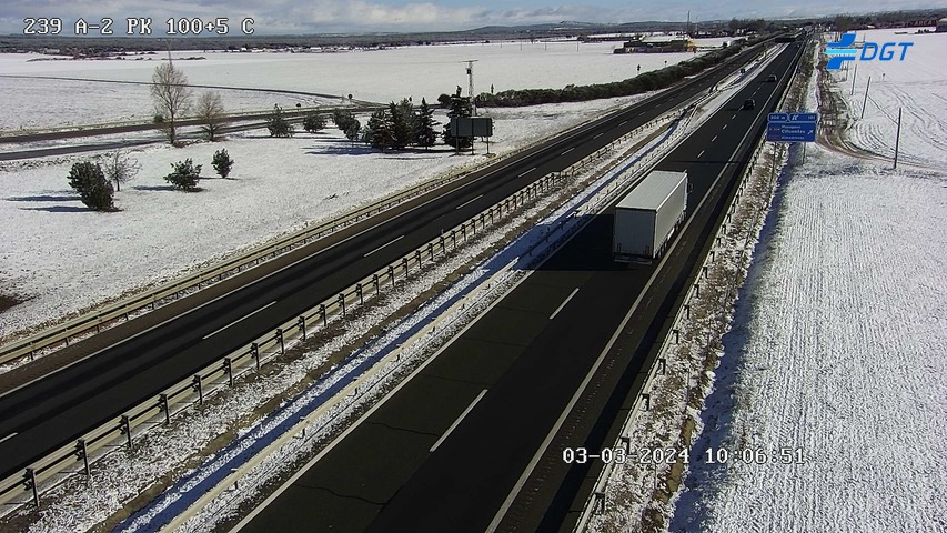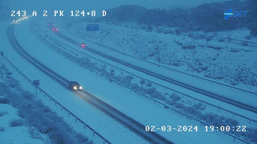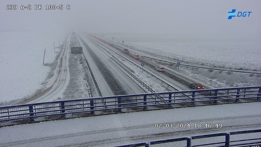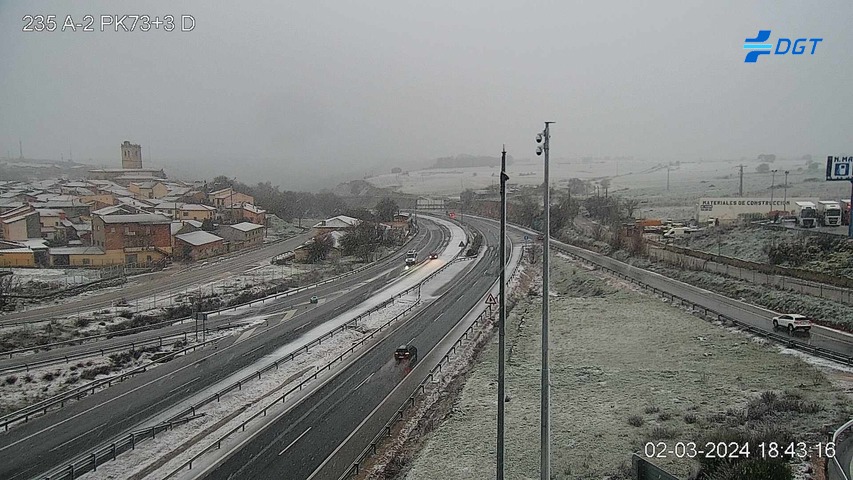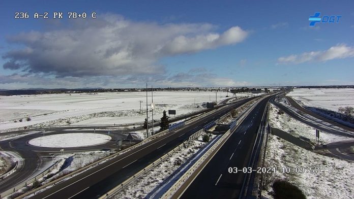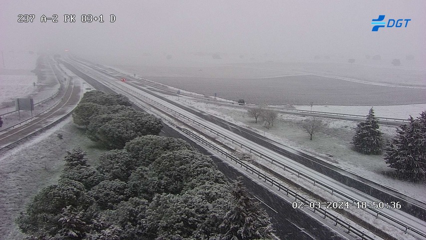 A mayor altura, desde Torija por ejemplo, la capa ha sido de nieve y de un cierto grosor, como se observa en las imágenes de la DGT, todas ellas en diferentes puntos de la A-2: