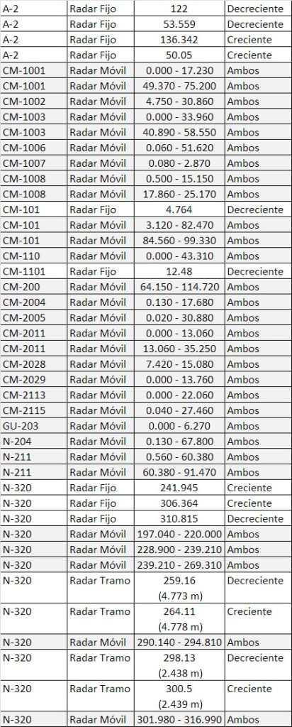 En Guadalajara, radares de tramo son conocidos desde hace años en la N-320, hacia Sacedón. Dentro de la provincia, las ubicaciones de radares, de cualquier tipo, que ha llegado a reconocer la DGT y según ha podido comprobar LA CRÓNICA, son los siguientes: