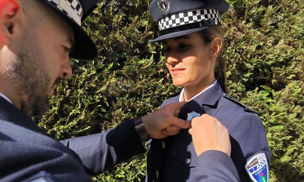 Además de recoger sus diplomas, el jefe de la Policía Local cabanillera impuso a sus nuevas compañeras y su nuevo compañero la insignia del cuerpo policial municipal.