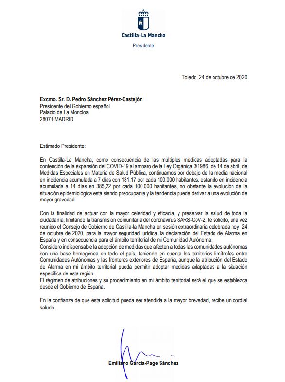 La petición de Castilla-La Mancha se ha plasmado en una carta, firmada por García-Page y remitida a Pedro Sánchez y ministra de Política Territorial este mismo sábado.