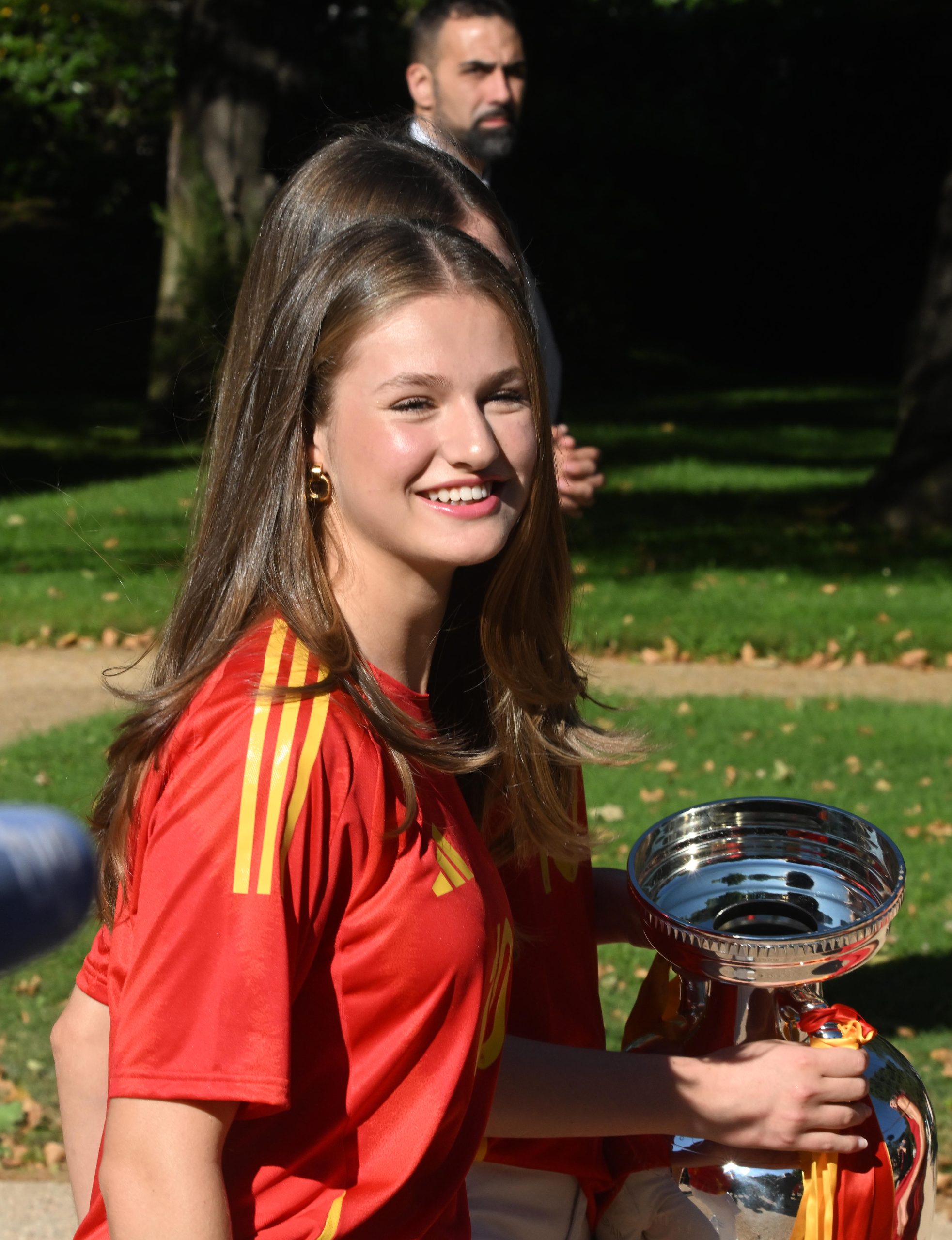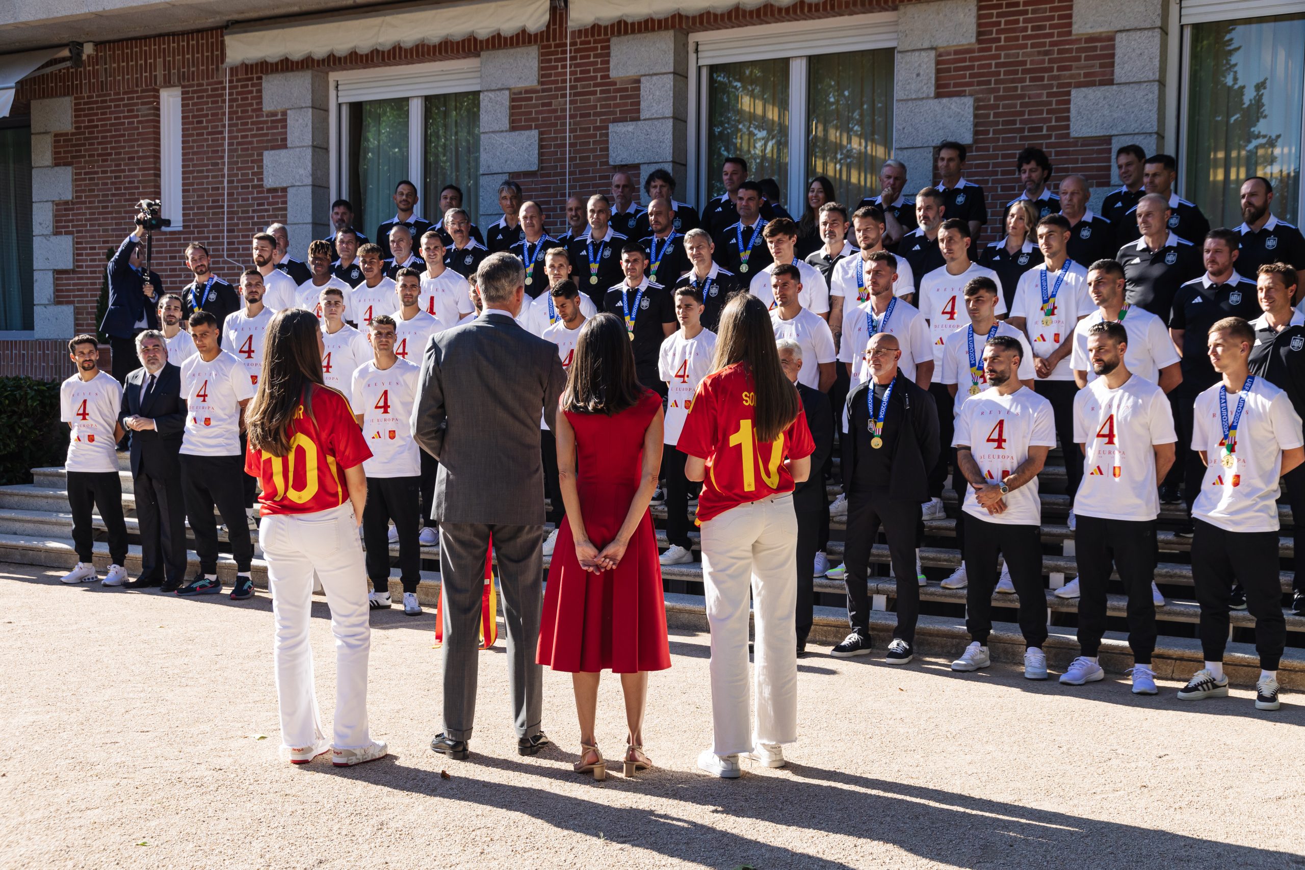 Felipe VI y Doña Letizia, acompañadas por sus dos hijas, Doña Leonor, Princesa de Asturias, y la Infanta Doña Sofía, ambas ataviadas con una camiseta de la ‘Roja’ con el número 10, y con la ministra de Educación, Formación Profesional y Deportes, Pilar Alegría, y el presidente del Consejo Superior de Deportes, José Manuel Rodríguez Uribes, recibieron a los internacionales a los que felicitaron por su victoria, aunque el monarca y su hija pequeña ya estuvieron presentes en la final e incluso Don Felipe fue el encargado de entregarles la copa de campeones.