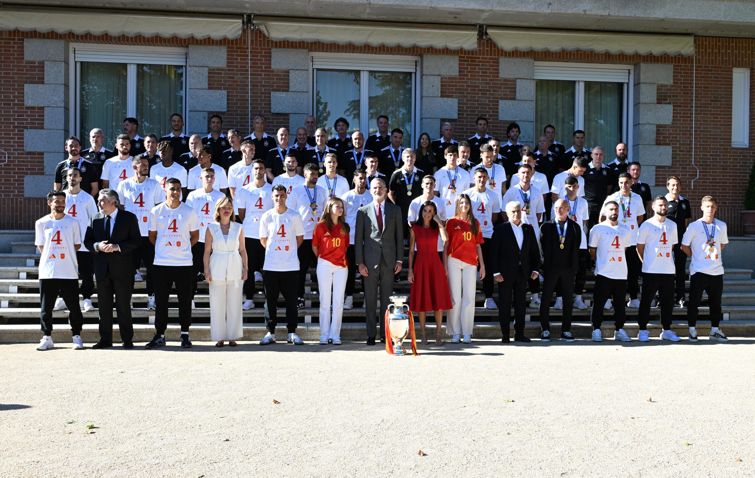 El combinado nacional, con sus jugadores portando una camiseta blanca con el ‘4’ en su parte delantera en referencia a sus cuatro títulos europeos, estuvo encabezado por el capitán Álvaro Morata, que entregó a Sus Majestades una camiseta firmada por todos los internacionales también con el ‘4’ y con el nombre ‘Reyes de Europa’ en el dorso, y el seleccionador nacional Luis de la Fuente, y también estaba el centrocampista del FC Barcelona Pablo Martín, ‘Gavi’, que por una grave lesión de rodilla en noviembre se perdió el torneo, la totalidad del ‘staff’ técnico y el presidente de la Real Federación Española de Fútbol (RFEF), Pedro Rocha.