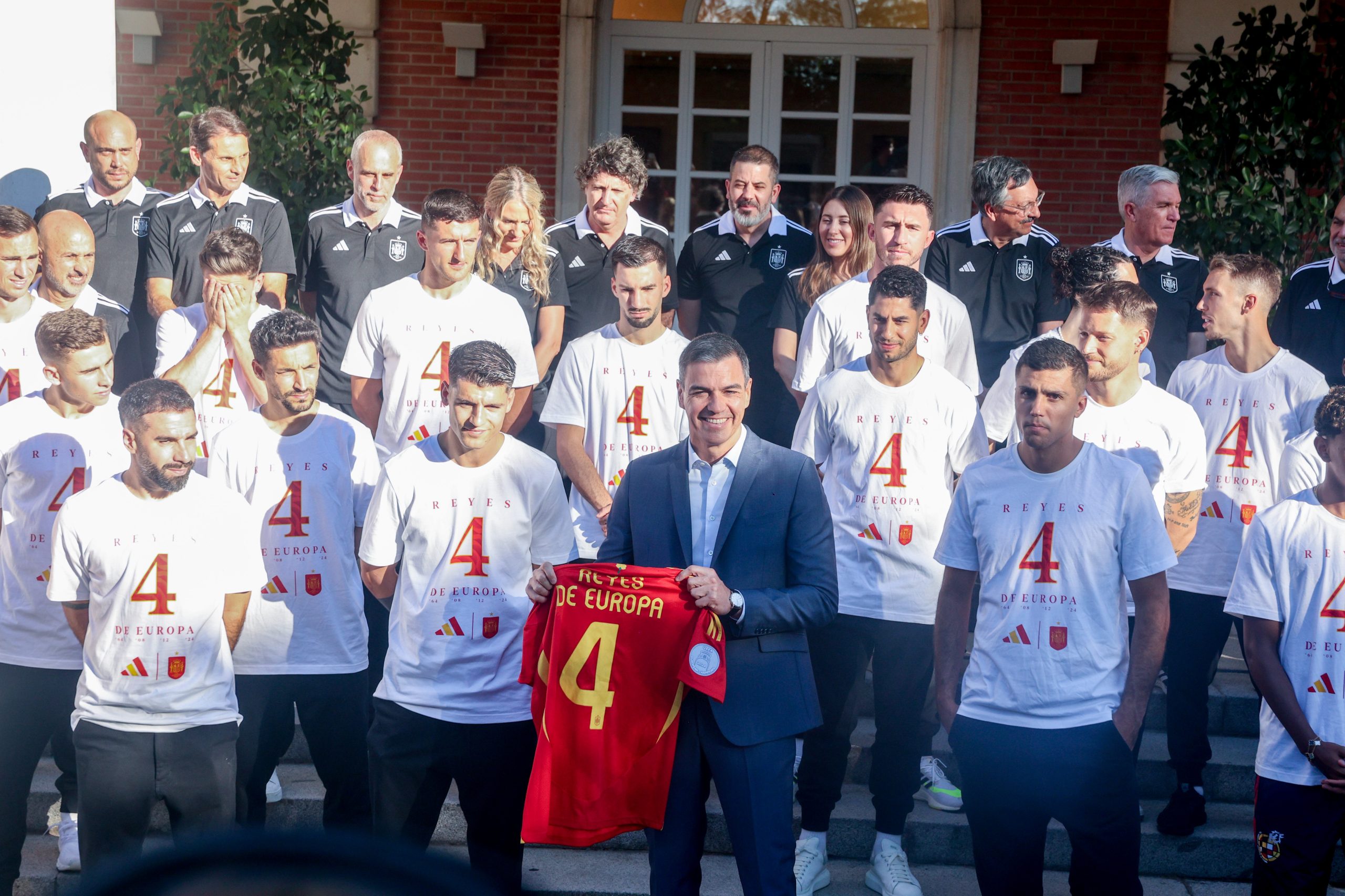 «Por tanto os deseo lo mejor. Daros la enhorabuena en nombre de toda la ciudadanía española y sobre todo que lo disfrutéis con vuestros seres queridos, con vuestras familias y con aquellos que de verdad os importan. Y eso, queremos más, a por todas», sentenció Pedro Sánchez, que recibió una camiseta con el número ‘4’ y con el emblema ‘Reyes de Europa’ en el dorso.