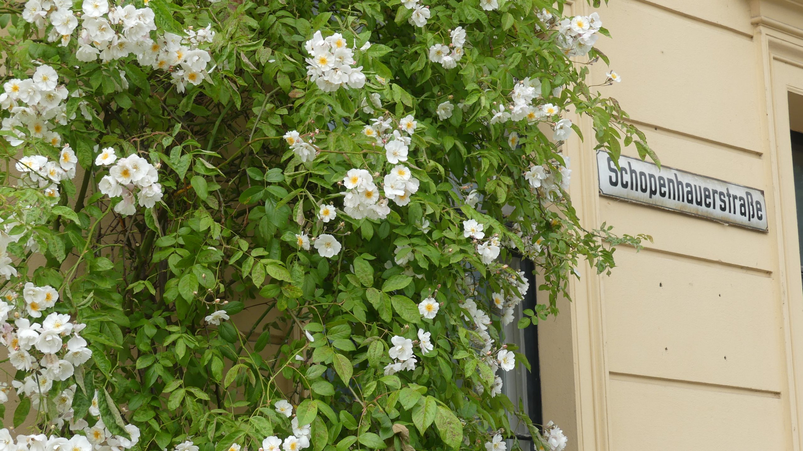 Como lo es la ironía de que haya de ser en la calle dedicada al filósofo alemán Arthur Schopenhauer, que hizo del pesimismo existencial su escudo y su bandera, donde encuentres un esplendoroso macizo de rosas blancas que levanta el ánimo del más desesperado.