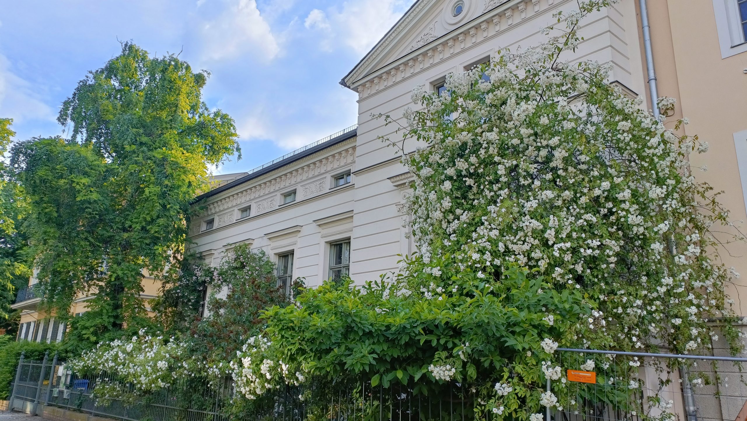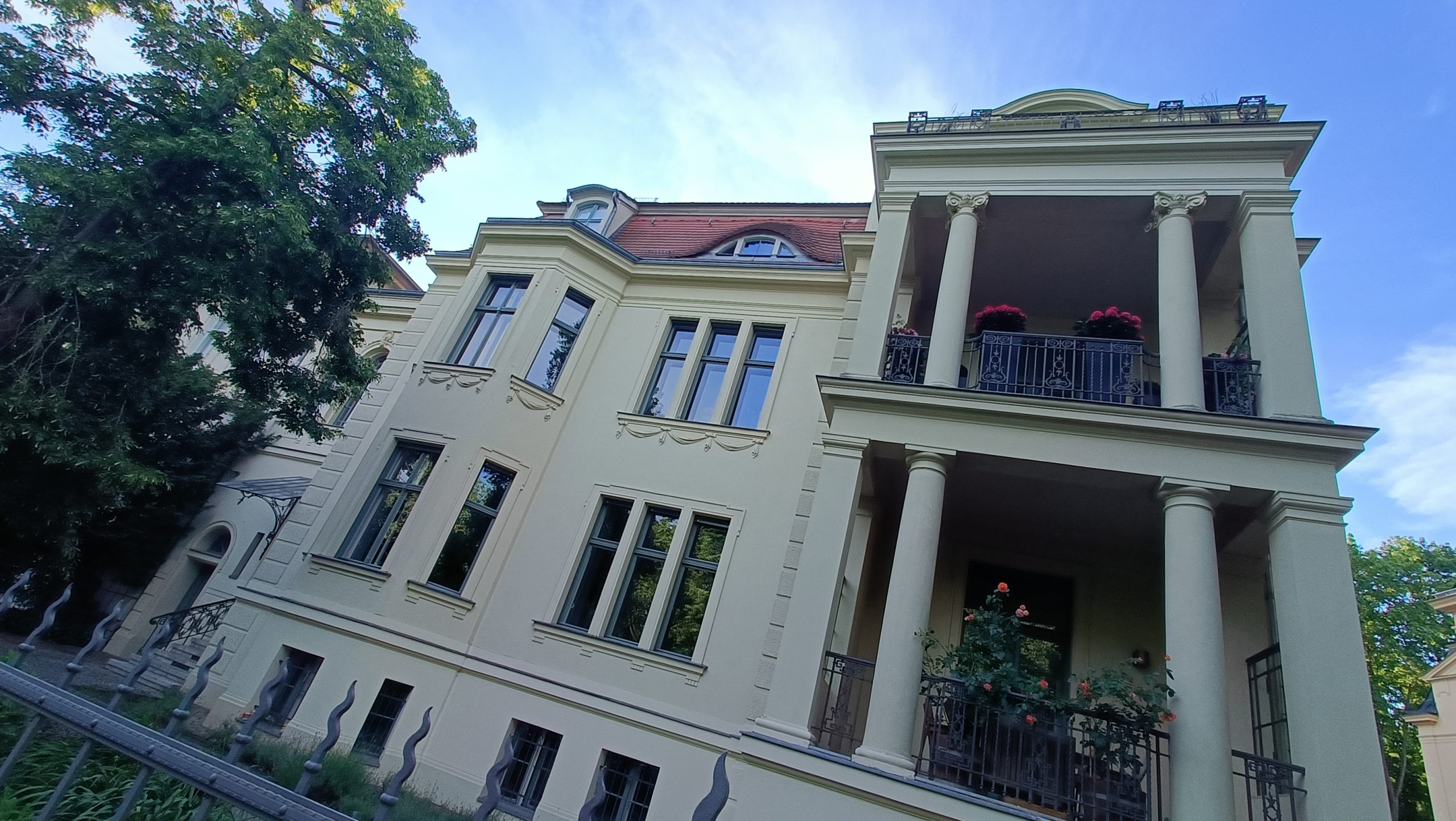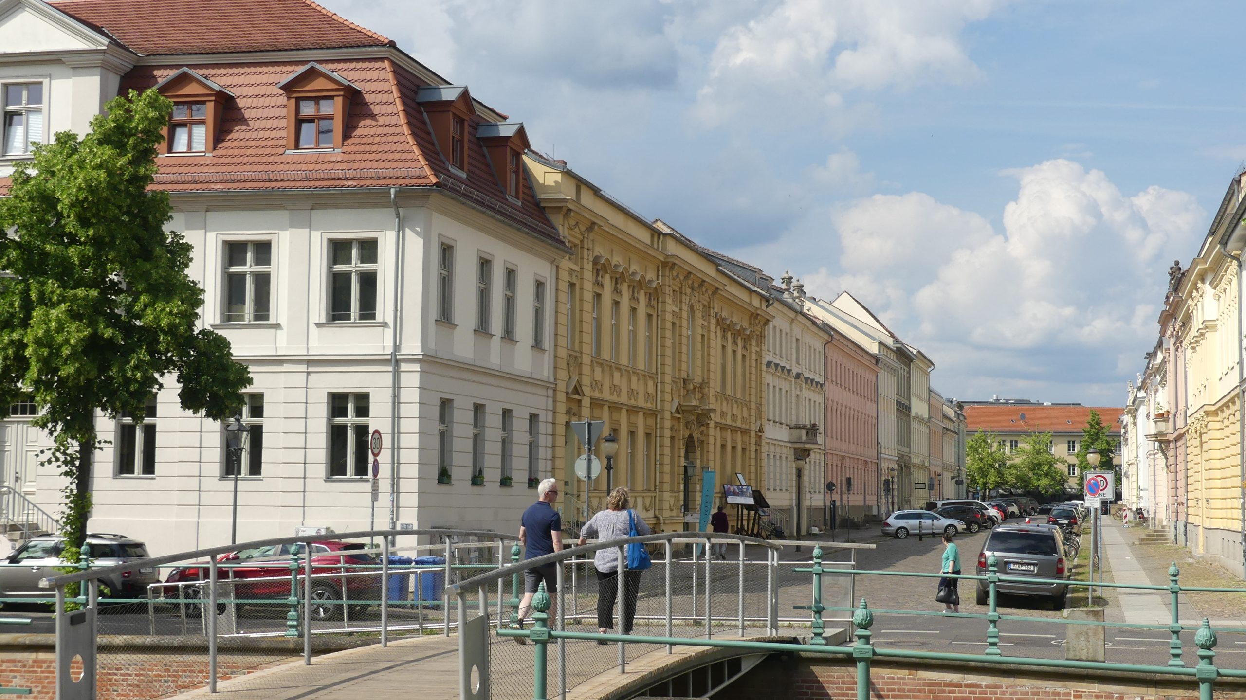 • Envidia de vivir como un burgués con posibles. Potsdam se ha ido convirtiendo desde hace tiempo en el refugio de muchos berlineses. De aquellos, claro está, que pueden permitírselo. Bordeando el Jardín Nuevo (el Neue Gartem, para entendernos mejor sobre el plano), una larga calle nos devuelve hacia el centro de la ciudad con una inesperada sorpresa: la inacabable sucesión de chalés y palacetes, entre lo neoclásico y lo decimonónico, donde viven los que pueden hacerlo. No todos son individuales, puesto que algunas grandes mansiones se han reconvertido para dar cabida a cuatro o seis nuevos propietarios, pero la envidia corroe, festivamente pero sin tregua, al paseante. Consuelo de pobre: si el dinero se gana bien y se gasta con salud y sin molestar, ¿qué cabe objetar?