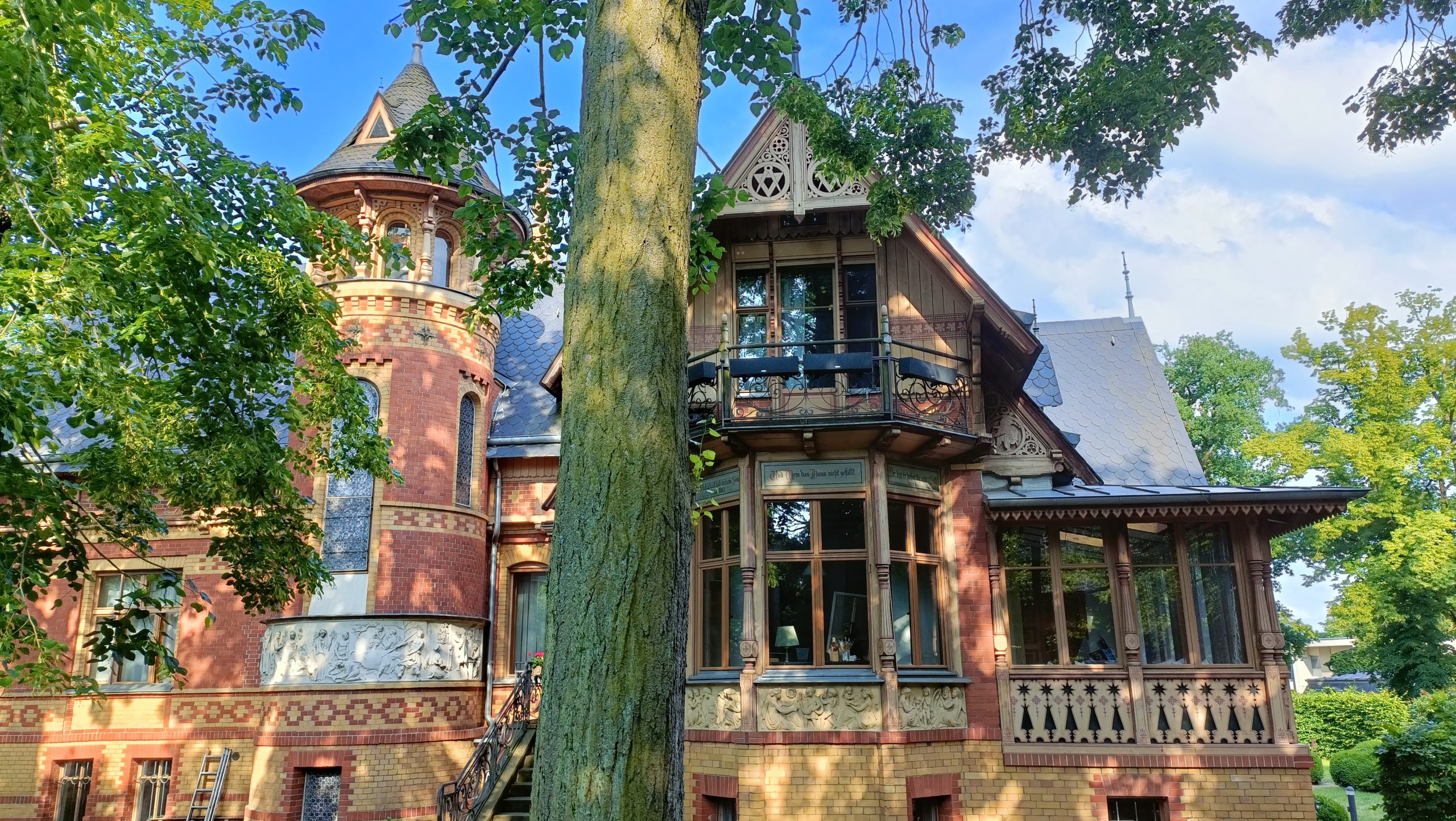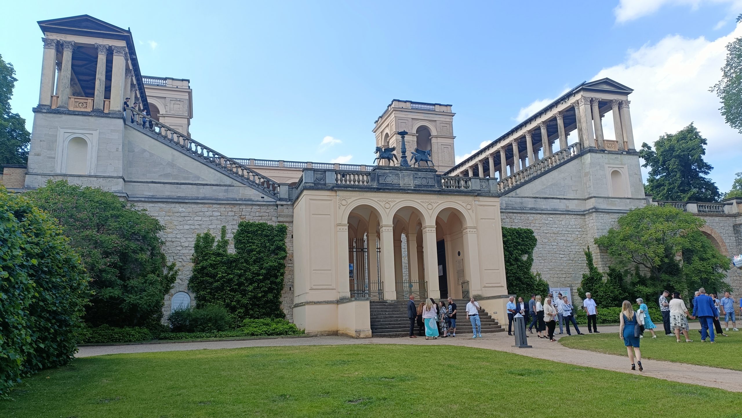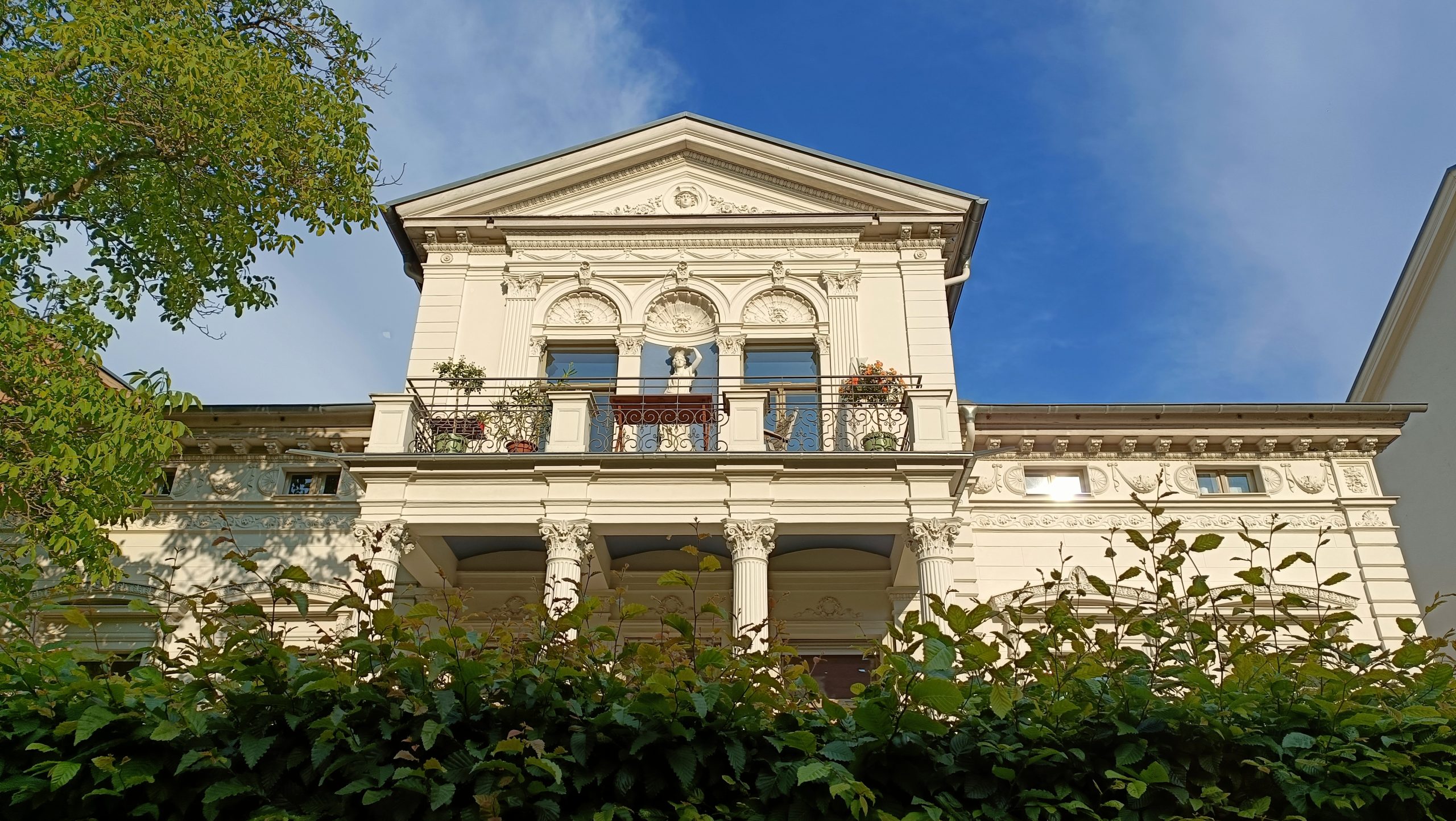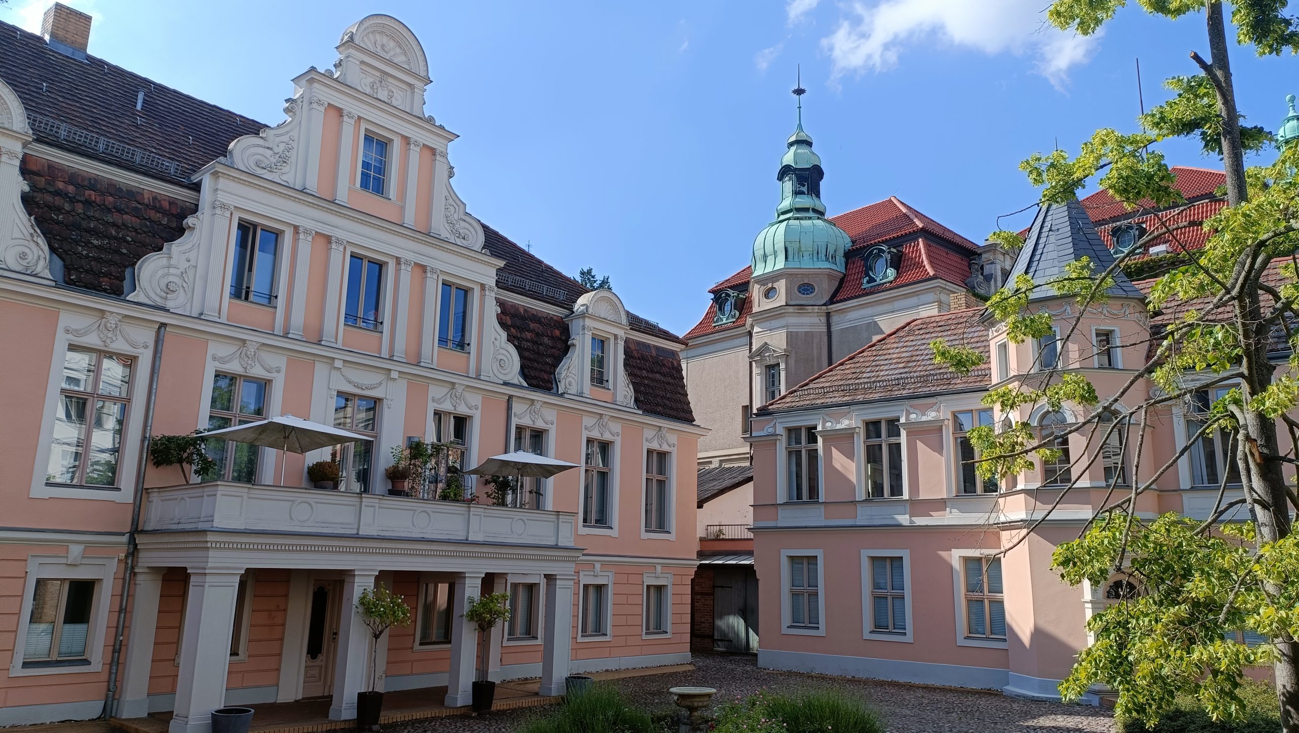 • Envidia de vivir como un burgués con posibles. Potsdam se ha ido convirtiendo desde hace tiempo en el refugio de muchos berlineses. De aquellos, claro está, que pueden permitírselo. Bordeando el Jardín Nuevo (el Neue Gartem, para entendernos mejor sobre el plano), una larga calle nos devuelve hacia el centro de la ciudad con una inesperada sorpresa: la inacabable sucesión de chalés y palacetes, entre lo neoclásico y lo decimonónico, donde viven los que pueden hacerlo. No todos son individuales, puesto que algunas grandes mansiones se han reconvertido para dar cabida a cuatro o seis nuevos propietarios, pero la envidia corroe, festivamente pero sin tregua, al paseante. Consuelo de pobre: si el dinero se gana bien y se gasta con salud y sin molestar, ¿qué cabe objetar?