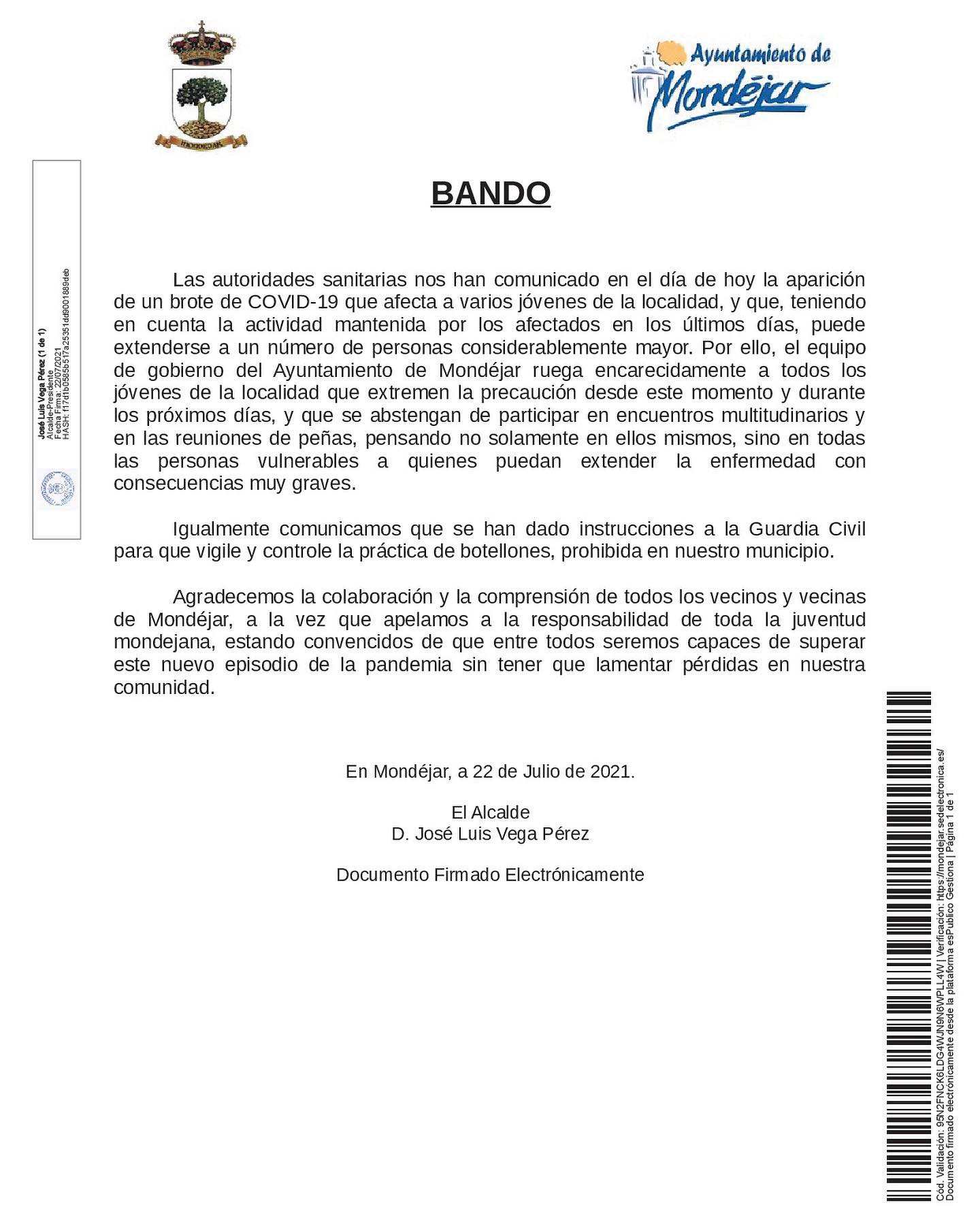 El Ayuntamiento de Mondéjar ha informado en un bando de que las autoridades sanitarias han confirmado un brote de Covid-19 en la localidad, que afecta a varios jóvenes. Por este motivo, se ha pedido a este segmento de edad de la población que extremen al máximo la prudencia y eviten actos multitudinarios en estos días, que coinciden con las fiestas de su Patrona.