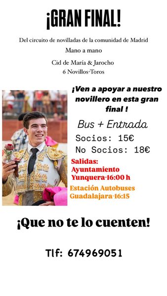 Quien quiera apoyar presencialmente al novillero puede aprovechar la iniciativa de la Asociación Taurina Cid de María, que desde hace días viene sumando interesados para acudir en autobús desde Yunquera de Henares, con salida a las cuatro de la tarde y en las condiciones que figuran en la ilustración adjunta.