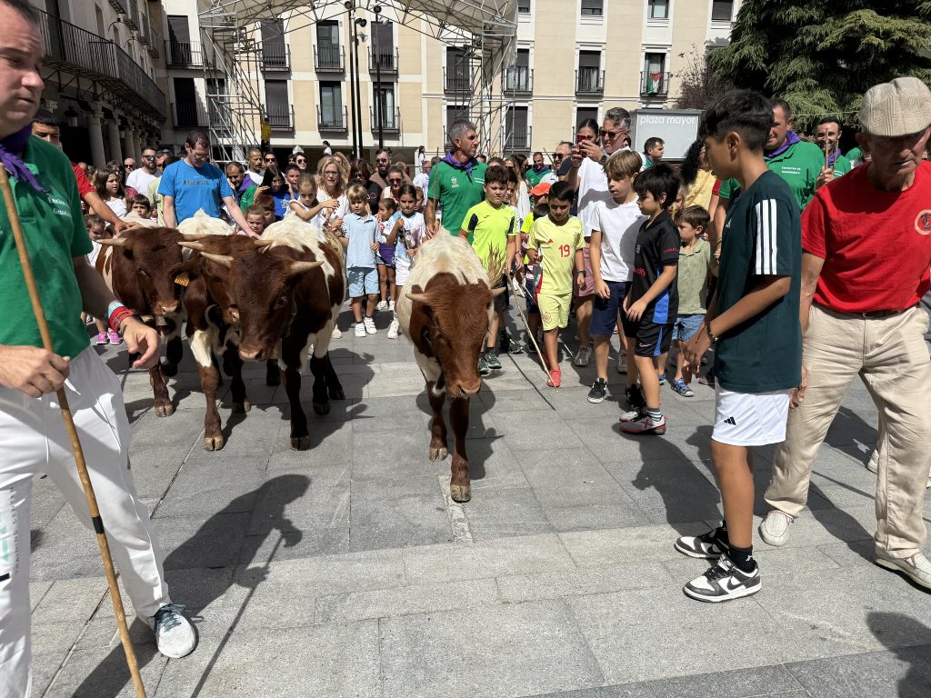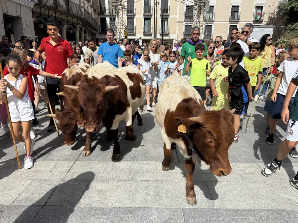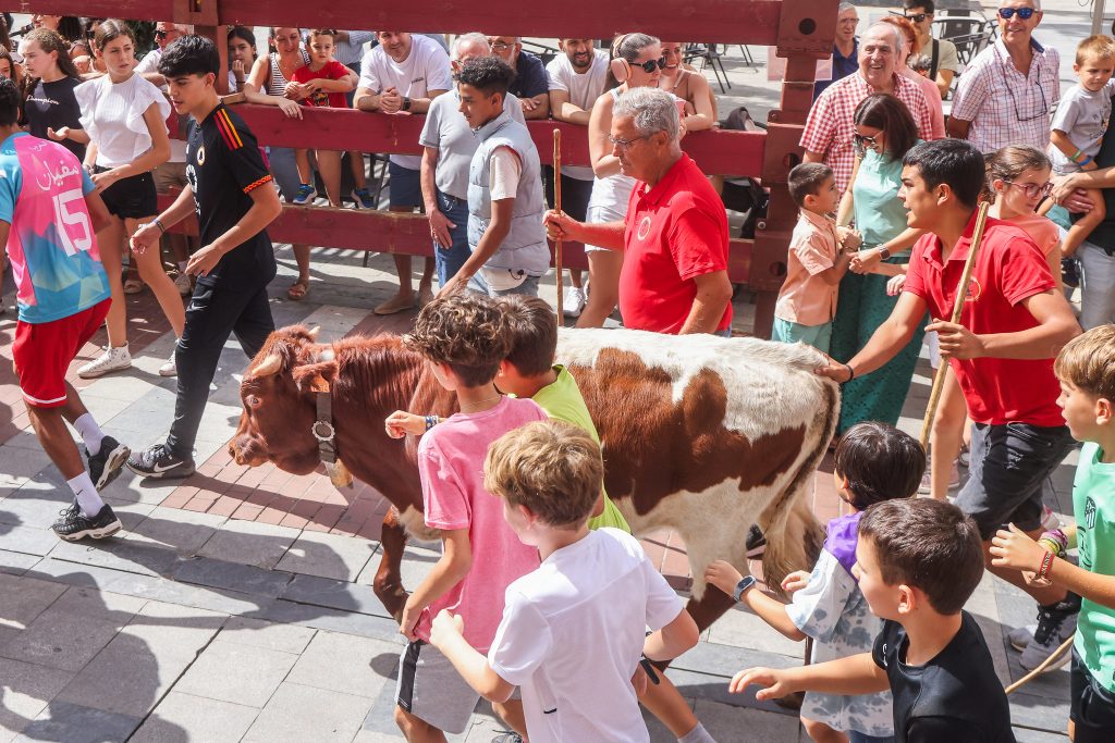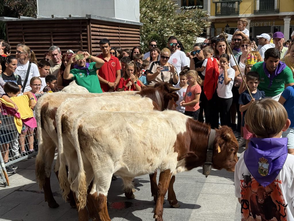 Los niños, de todas las edades, acompañados de sus padres, han sido los auténticos protagonistas, y han corrido junto a reses más que adaptadas a la «talla» de los pequeños: cuatro becerros añojos. Han podido ejercer de pastores, guiando la pequeña bueyada junto a los pastores adultos y también han llenado las talanqueras y las gradas como espectadores.