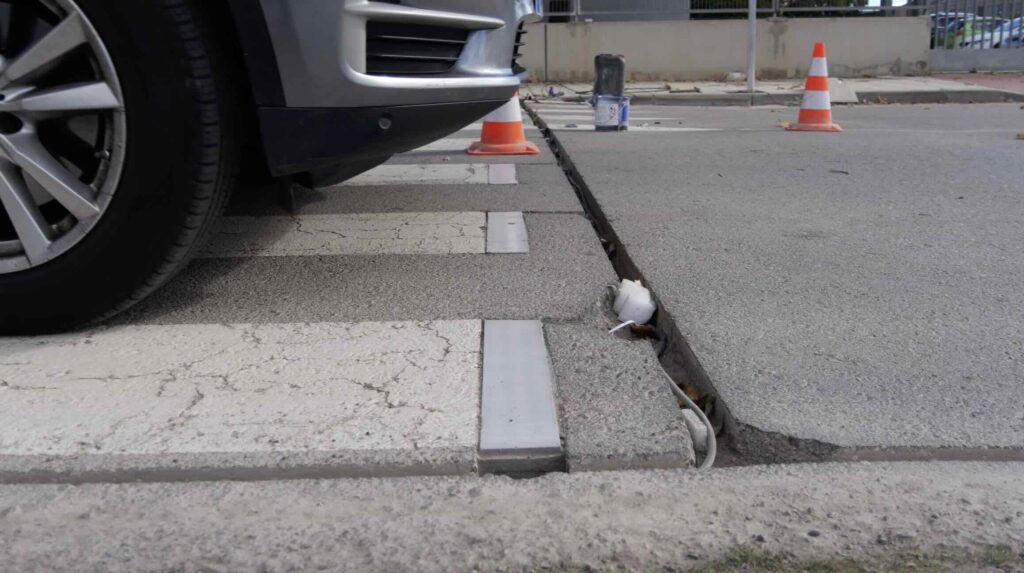 Todos los pasos de peatones incorporan señales led de advertencia por cada sentido de circulación e incluyen placas lumínicas fijadas al pavimento, a ras de suelo y colocadas delante del paso de peatones para reforzar el aviso luminoso.