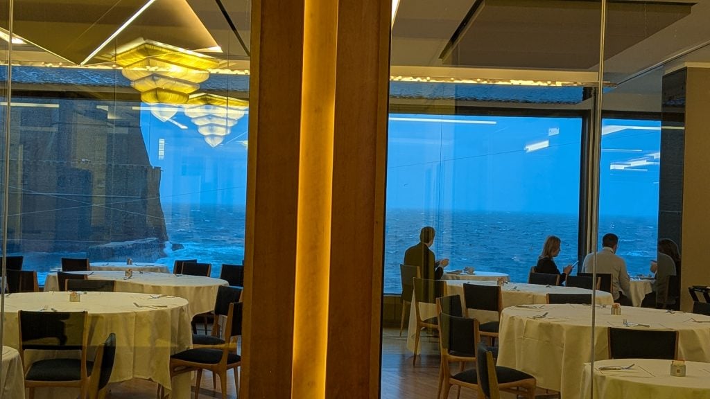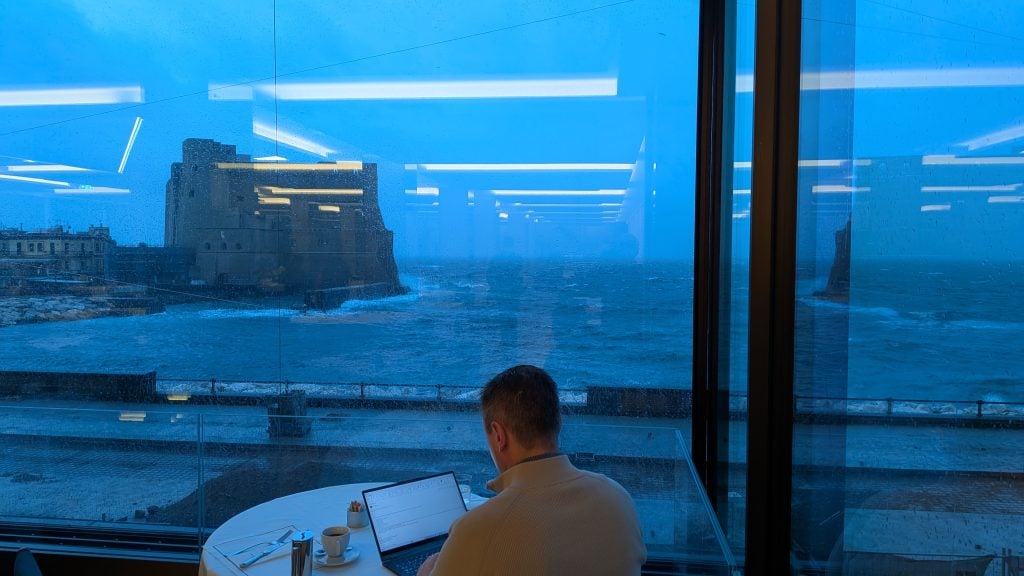 Con la modorra del trasnoche no has calibrado bien dónde estás, pero la cristalera que corre de punta a punta el fondo del salón te va descubriendo, según clarea, el espectáculo del mar fundido con el cielo y, a la izquierda, la silueta cada vez más perfilada del Castell dell’Ovo.