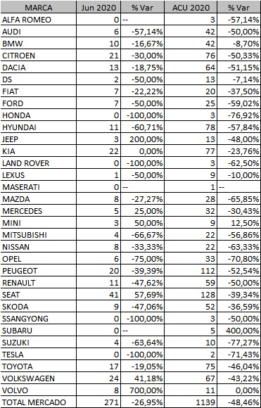Las cifras relativas al pasado mes de junio son las que a continuación reproducimos y resultan muy interesantes. Las mayores ventas se las lleva Seat, aunque el mayor crecimiento lo registra Volvo. A lo largo de este año, Peugeot va salvando la situación casi mejor que nadie en la provincia.