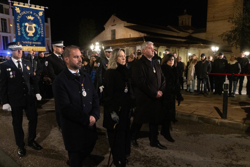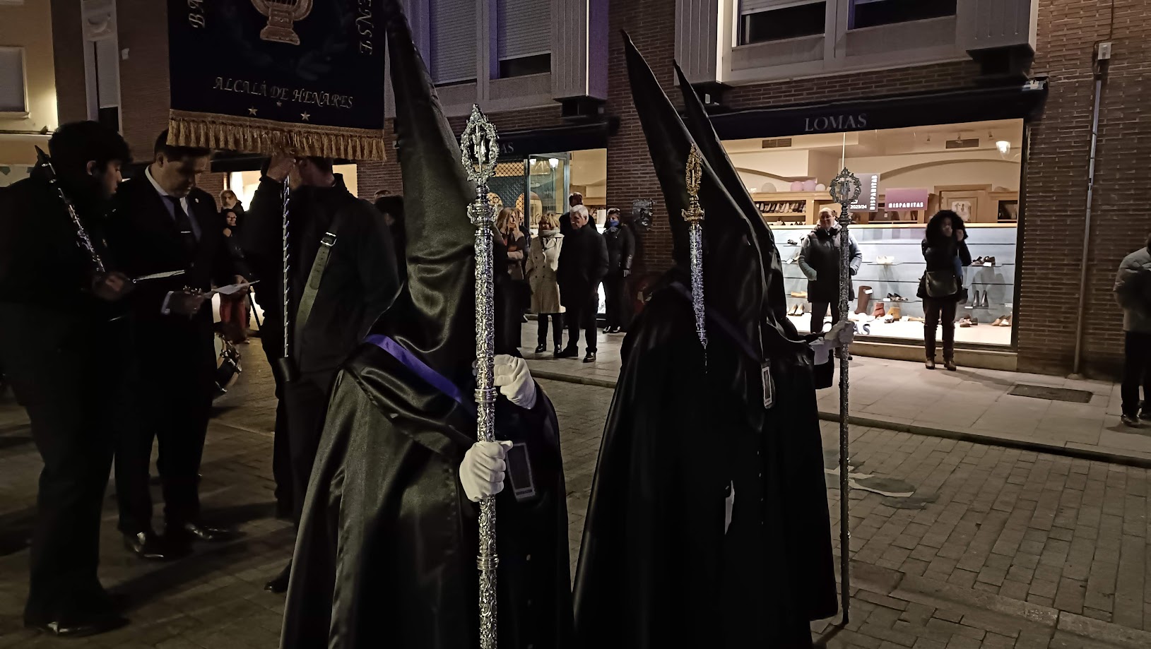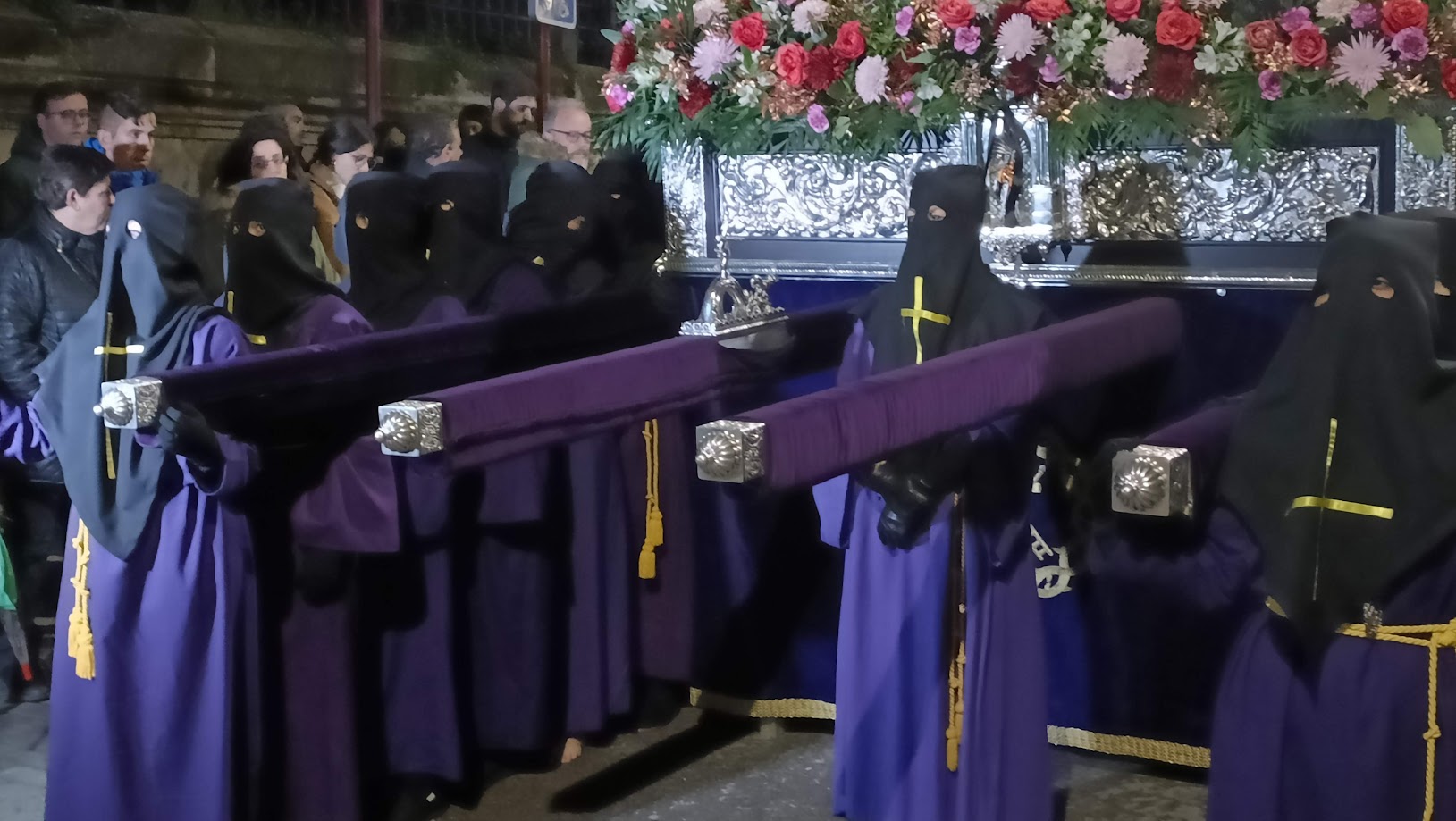 Las nubes pararon de descargar durante unas horas, dando paso a un frío cada vez más intenso. Con una hora de retraso sobre lo anunciado en el programa, desde la concatedral se fueron sumando al recorrido pasos y cofrades. Los políticos esperaban pacientemente, al igual que cientos de fieles y curiosos.