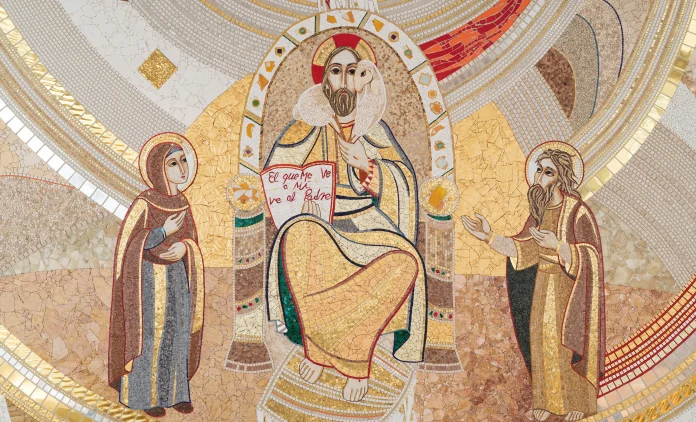 El mosaico tiene en su centro la imagen del Buen Pastor, con la Virgen María y San Juan Bautista a los lados, «enmarcados en un círculo de oro que desciende». A ambos lados, escenas del Antiguo y Nuevo Testamento.