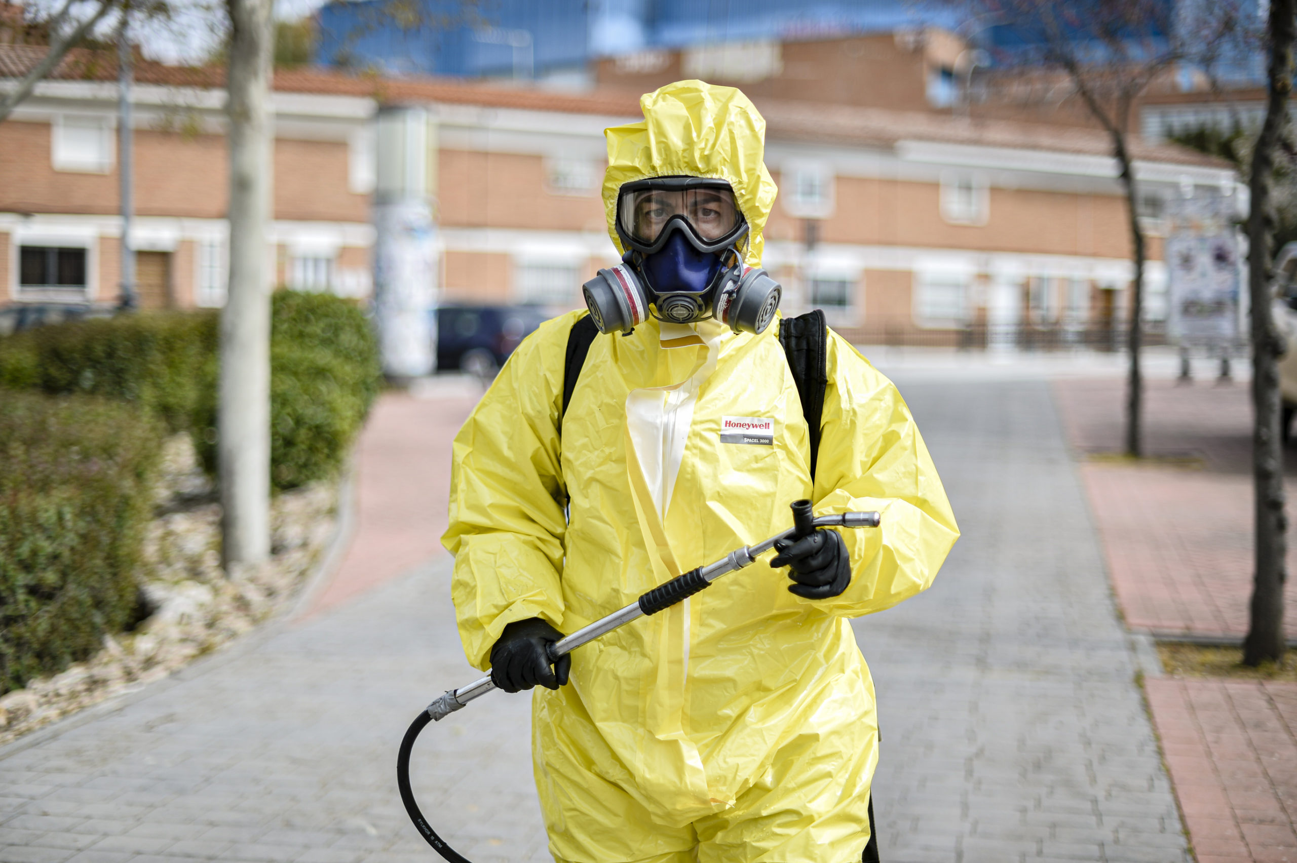 • Con 45 años como argumento, esta mujer es mucha mujer, aunque no se vea de su fisonomía ni de su personalidad más que lo poco que permite la pantalla de su visera. Ella está ahí, debajo de tres capas de polietileno. Si esto fuera un pase de modelos, describiríamos lo que vemos como «Buzo de polietileno amarillo con cremallera y costuras selladas. Protección química excelente. Superficie lisa que facilita la evacuación de liquidos. Muy buena resistencia a la abrasión, al desgarro y a la perforación. Estiramiento del material hasta un 400 %». Pero no es un pase de modelos sino la puñetera realidad, sin margen para la frivolidad. Y Rebeca está en medio, jugándose su salud para asegurar la nuestra, desinfectando las calles y los edificios del bicho canalla que no se ve pero que está ahí. Como Rebeca. Uno, mata. Ella, salva.