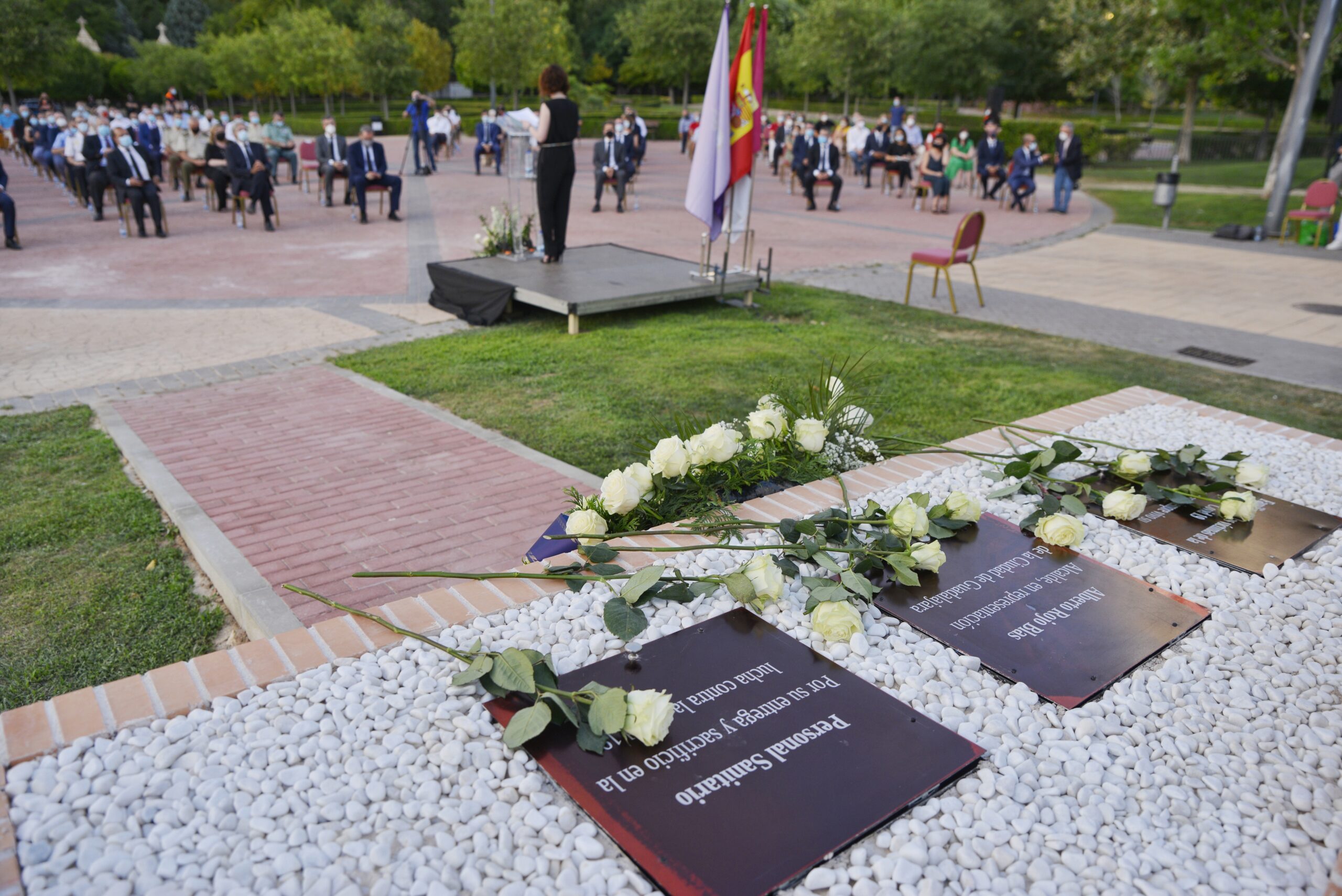 Los representantes institucionales depositaron una rosa blanca a los pies del monumento, después de la intervención de un familiar de una de las víctimas, Alfonso Santos, y de que el alcalde, Alberto Rojo, y el primer teniente de alcalde, Rafael Pérez Borda, hubieran depositado una corona de flores blancas representando a toda la ciudad de Guadalajara.