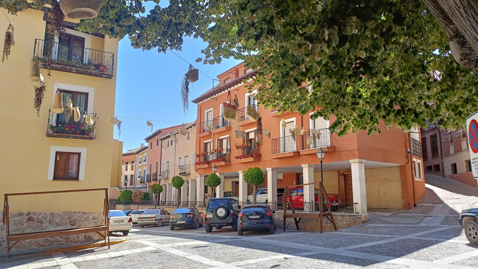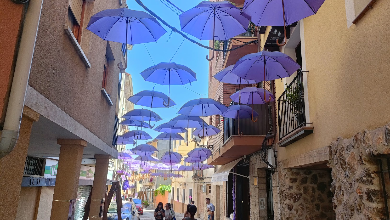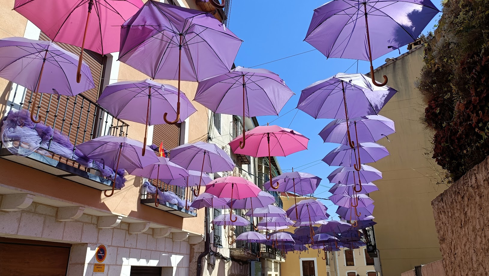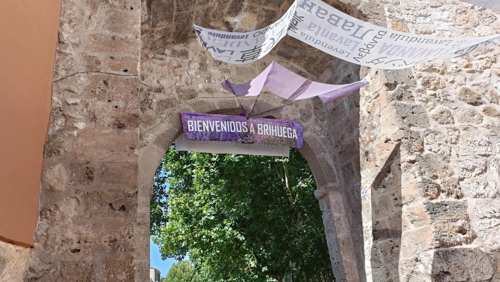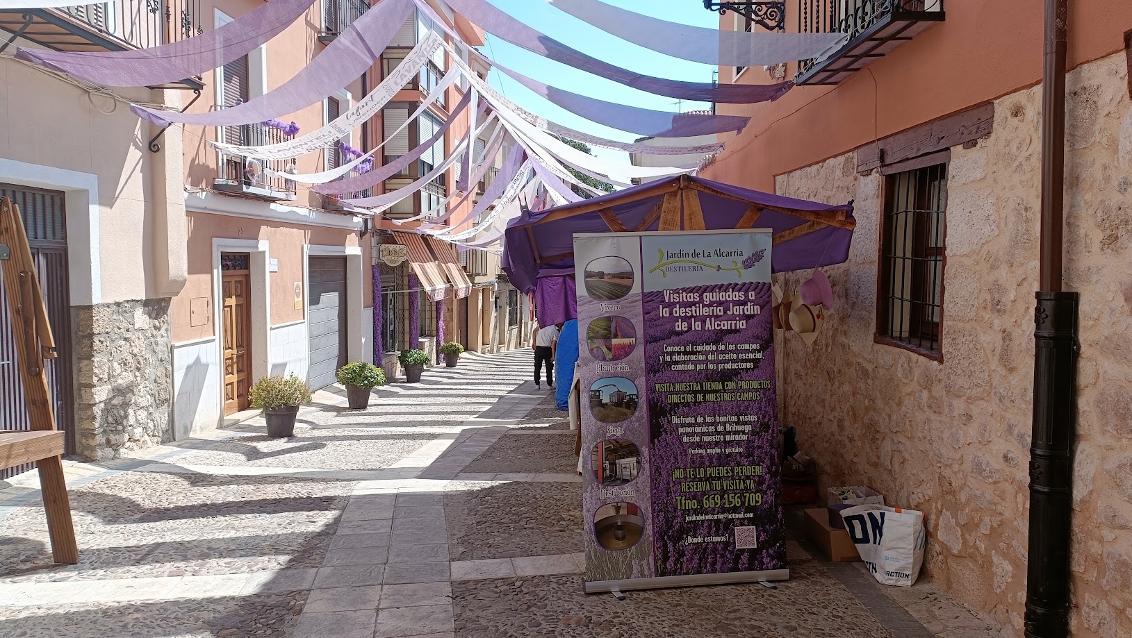 «Las calles peatonales de Brihuega están decoradas con serpentinas de color lavanda y sombrillas moradas colgantes», detalla el minucioso Merchant en su artículo. Y es así. Para comprobarlo, el 17 de julio un par de redactores de este diario se asomaron por allí, bajo un sol sofocante, a la hora (celtibérica) de la comida. Lo que vienen a ser las tres, para aclararnos.