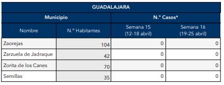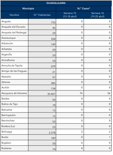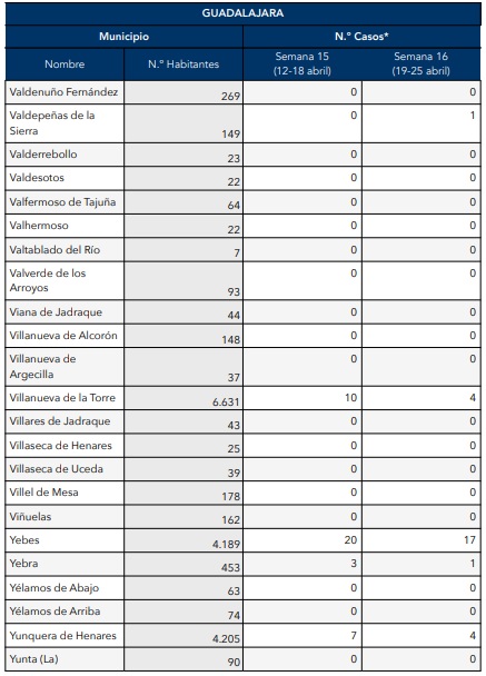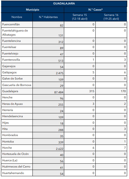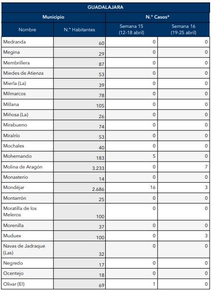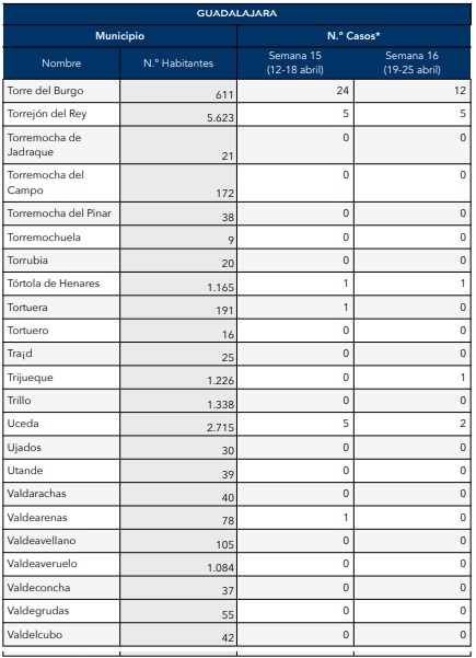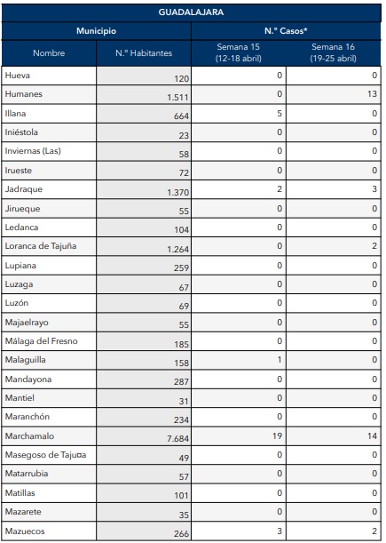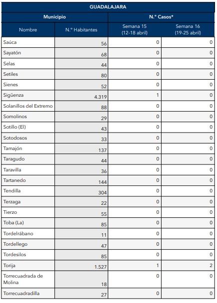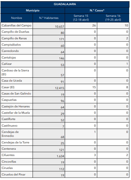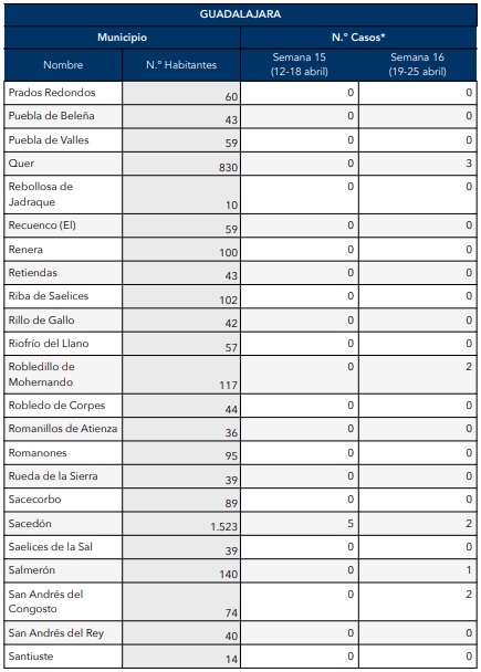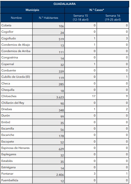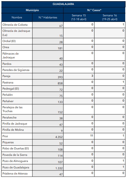 Menos significativos podrían ser los casos nuevos de Alarilla (de 0 a 2), Alcocer (de 0 a 1), Budia (de 0 a 1), Campillo de Ranas (de 0 a 2), Cañizar (de 0 a 1), El Cubillo de Uceda (de 0 a 1), Driebes (de 1 a 2), Hontoba (de 0 a 1), Loranca de Tajuña (de 0 a 2), Olmeda de Cobeta (de 0 a 1), Pastrana (de 0 a 1), Pozo de Almoguera (de 0 a 1), Pozo de Guadalajara (de 0 a 1), Robledillo de Mohernando (de 0 a 2), Salmerón (de 0 a 1), San Andrés del Congosto (de 0 a 2) y Valdepeñas de la Sierra, de 0 a 1.