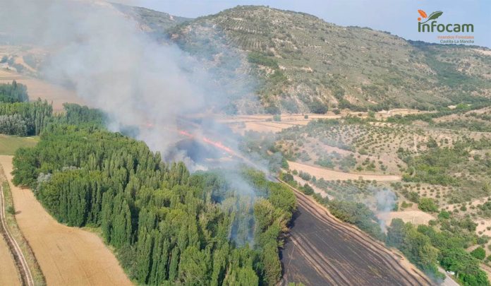 Cinco medios terrestres y 24 efectivos continúan con las labores de extinción, según asegura el Servicio de Prevención y Extinción de Incendios Forestales del Gobierno de Castilla-La Mancha desde su cuenta en la red social X.