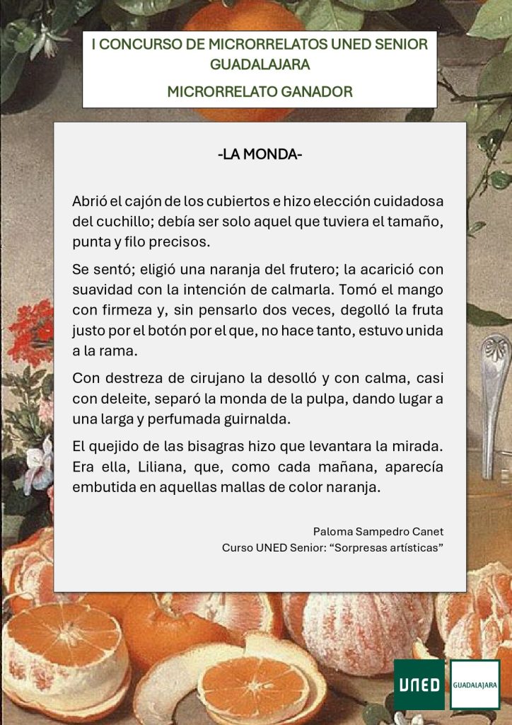 El jurado ha resaltado «la destreza en el uso preciso y certero de las formas verbales que dotan al relato de un ritmo ágil y sincopado. La autora concentra en un espacio muy reducido -en apenas diez líneas- la descripción de un proceso físico que acaba alcanzando una dimensión psicológica, y su lectura logra transformar cada uno de los objetos del relato en sensaciones anticipadoras. Un microrrelato, en definitiva, fabulosamente construido», se detalla desde la UNED.