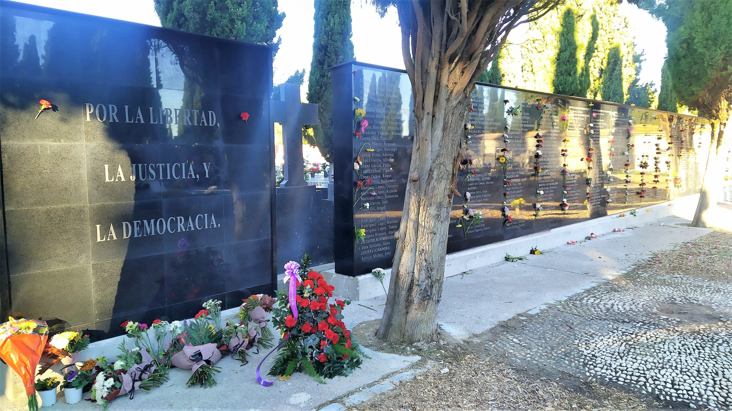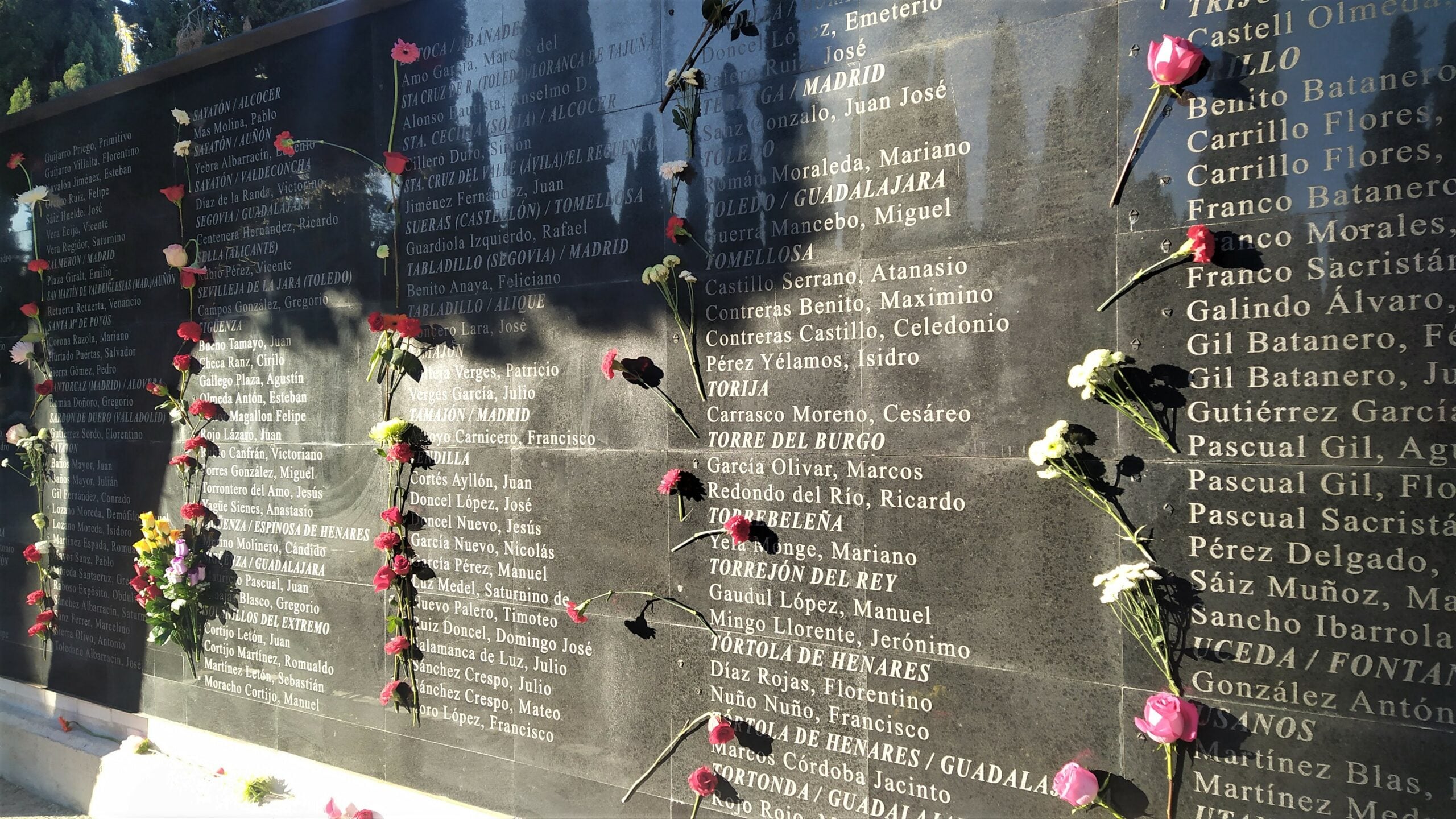 En el resto del muro siguen prendidas numerosas flores, a lo largo de la relación grabada en mármol de casi un millar de represaliados, asesinados la mayoría en los primeros años posteriores a la Guerra Civil.